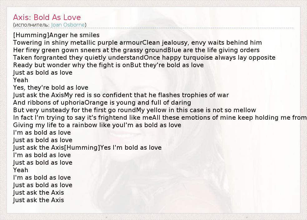 [Humming]Anger he smiles Towering in shiny metallic purple armourClean jealousy, envy waits behind him Her firey green gown sneers at the grassy groundBlue are the life giving orders Taken forgranted they quietly understandOnce happy turquoise always lay opposite Ready but wonder why the fight is onBut they're bold as love Just as bold as love Yeah Yes, they're bold as love Just ask the AxisMy red is so confident that he flashes trophies of war And ribbons of uphoriaOrange is young and full of daring But very unsteady for the first go roundMy yellow in this case is not so mellow In fact I'm trying to say it's frightend like meAll these emotions of mine keep holding me from Giving my life to a rainbow like youI'm as bold as love I'm as bold as love Just as bold as love Just ask the Axis[Humming]Yes I'm bold as love I'm as bold as love Just as bold as love Yeah I'm as bold as love Just as bold as love Just ask the Axis Just ask the Axis