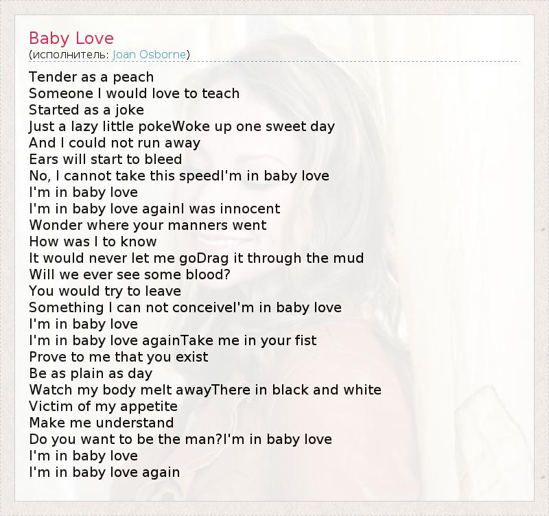 Tender as a peach Someone I would love to teach Started as a joke Just a lazy little pokeWoke up one sweet day And I could not run away Ears will start to bleed No, I cannot take this speedI'm in baby love I'm in baby love I'm in baby love againI was innocent Wonder where your manners went How was I to know It would never let me goDrag it through the mud Will we ever see some blood? You would try to leave Something I can not conceiveI'm in baby love I'm in baby love I'm in baby love againTake me in your fist Prove to me that you exist Be as plain as day Watch my body melt awayThere in black and white Victim of my appetite Make me understand Do you want to be the man?I'm in baby love I'm in baby love I'm in baby love again