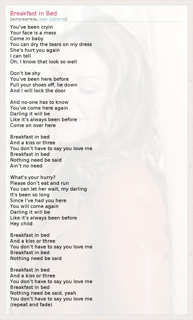 You've been cryin Your face is a mess Come in baby You can dry the tears on my dress She's hurt you again I can tell Oh, I know that look so well Don't be shy You've been here before Pull your shoes off, lie down And I will lock the door And no-one has to know You've come here again Darling it will be Like it's always been before Come on over here Breakfast in bed And a kiss or three You don't have to say you love me Breakfast in bed Nothing need be said Ain't no need What's your hurry? Please don't eat and run You can let her wait, my darling It's been so long Since I've had you here You will come again Darling it will be Like it's always been before Hey child Breakfast in bed And a kiss or three You don't have to say you love me Breakfast in bed Nothing need be said Breakfast in bed And a kiss or three You don't have to say you love me Breakfast in bed Nothing need be said, yeah You don't have to say you love me (repeat and fade)