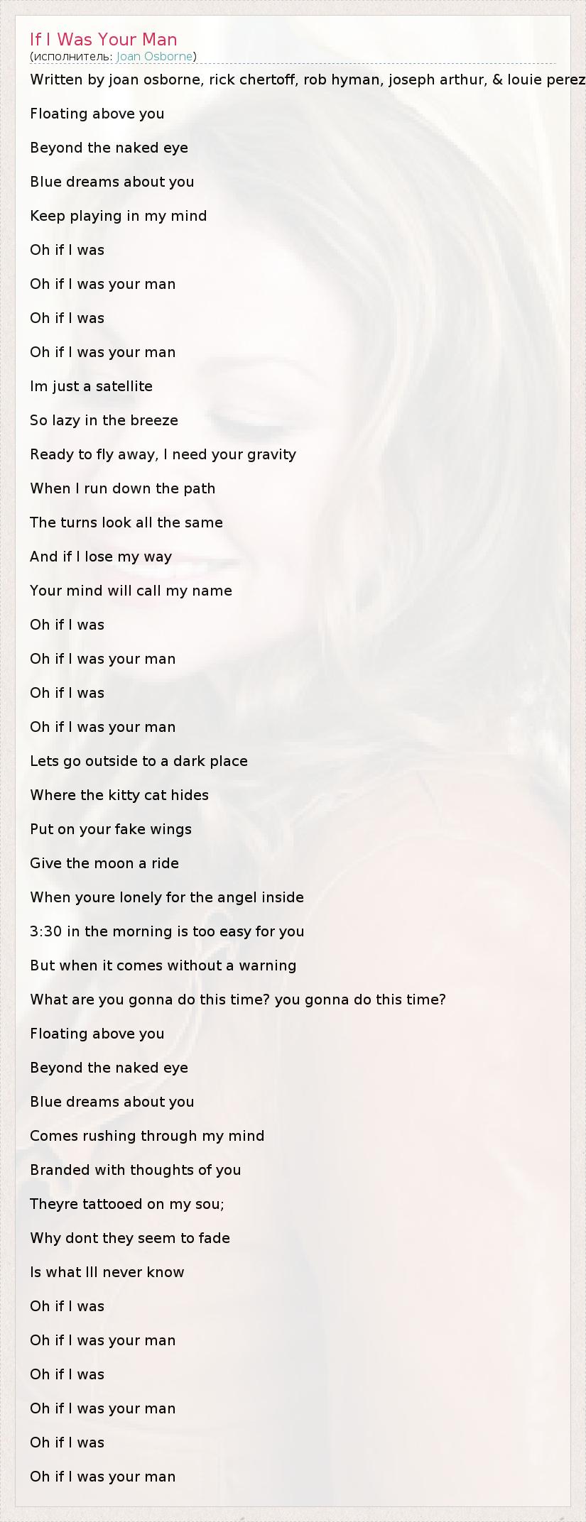 Written by joan osborne, rick chertoff, rob hyman, joseph arthur, & louie perez Floating above you Beyond the naked eye Blue dreams about you Keep playing in my mind Oh if I was Oh if I was your man Oh if I was Oh if I was your man Im just a satellite So lazy in the breeze Ready to fly away, I need your gravity When I run down the path The turns look all the same And if I lose my way Your mind will call my name Oh if I was Oh if I was your man Oh if I was Oh if I was your man Lets go outside to a dark place Where the kitty cat hides Put on your fake wings Give the moon a ride When youre lonely for the angel inside 3:30 in the morning is too easy for you But when it comes without a warning What are you gonna do this time? you gonna do this time? Floating above you Beyond the naked eye Blue dreams about you Comes rushing through my mind Branded with thoughts of you Theyre tattooed on my sou; Why dont they seem to fade Is what Ill never know Oh if I was Oh if I was your man Oh if I was Oh if I was your man Oh if I was Oh if I was your man