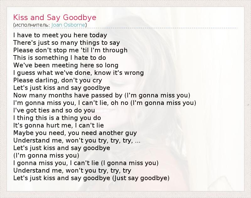 I have to meet you here today There's just so many things to say Please don't stop me 'til I'm through This is something I hate to do We've been meeting here so long I guess what we've done, know it's wrong Please darling, don't you cry Let's just kiss and say goodbye Now many months have passed by (I'm gonna miss you) I'm gonna miss you, I can't lie, oh no (I'm gonna miss you) I've got ties and so do you I thing this is a thing you do It's gonna hurt me, I can't lie Maybe you need, you need another guy Understand me, won't you try, try, try, ... Let's just kiss and say goodbye (I'm gonna miss you) I gonna miss you, I can't lie (I gonna miss you) Understand me, won't you try, try, try Let's just kiss and say goodbye (Just say goodbye)