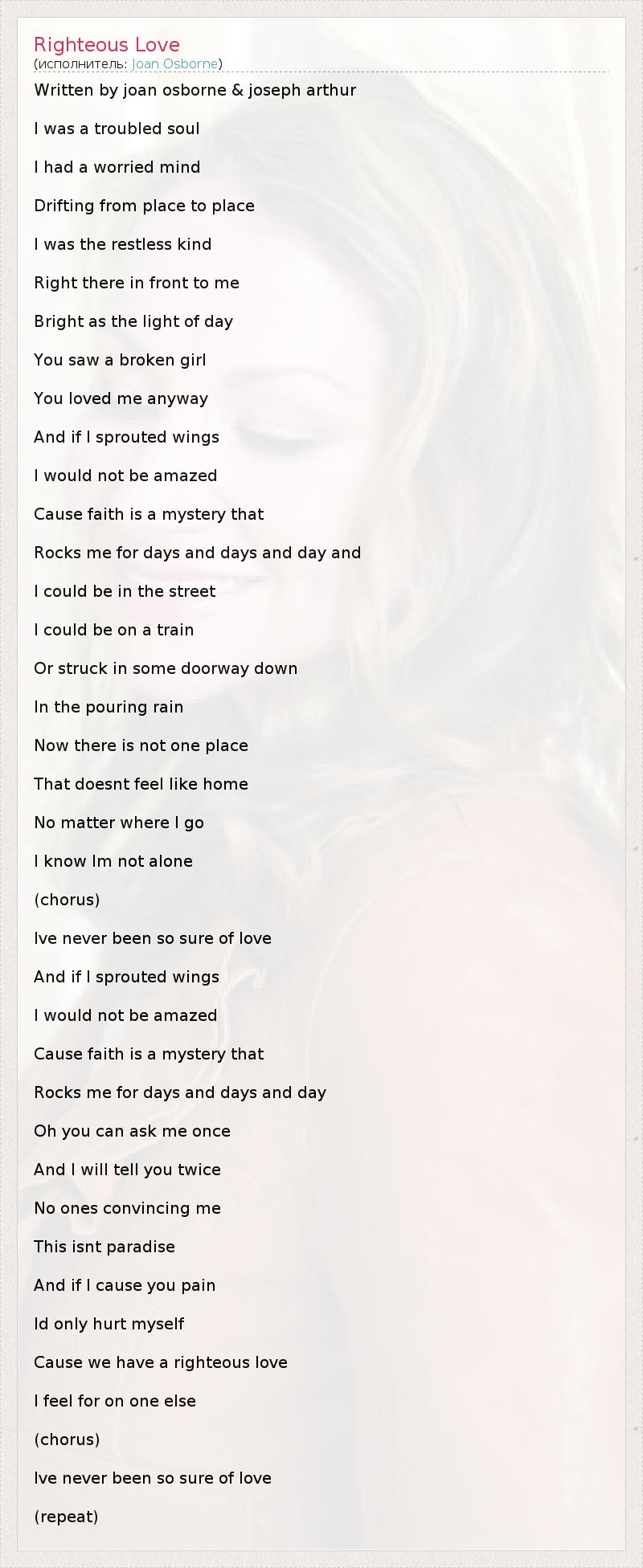Written by joan osborne & joseph arthur I was a troubled soul I had a worried mind Drifting from place to place I was the restless kind Right there in front to me Bright as the light of day You saw a broken girl You loved me anyway And if I sprouted wings I would not be amazed Cause faith is a mystery that Rocks me for days and days and day and I could be in the street I could be on a train Or struck in some doorway down In the pouring rain Now there is not one place That doesnt feel like home No matter where I go I know Im not alone (chorus) Ive never been so sure of love And if I sprouted wings I would not be amazed Cause faith is a mystery that Rocks me for days and days and day Oh you can ask me once And I will tell you twice No ones convincing me This isnt paradise And if I cause you pain Id only hurt myself Cause we have a righteous love I feel for on one else (chorus) Ive never been so sure of love (repeat)