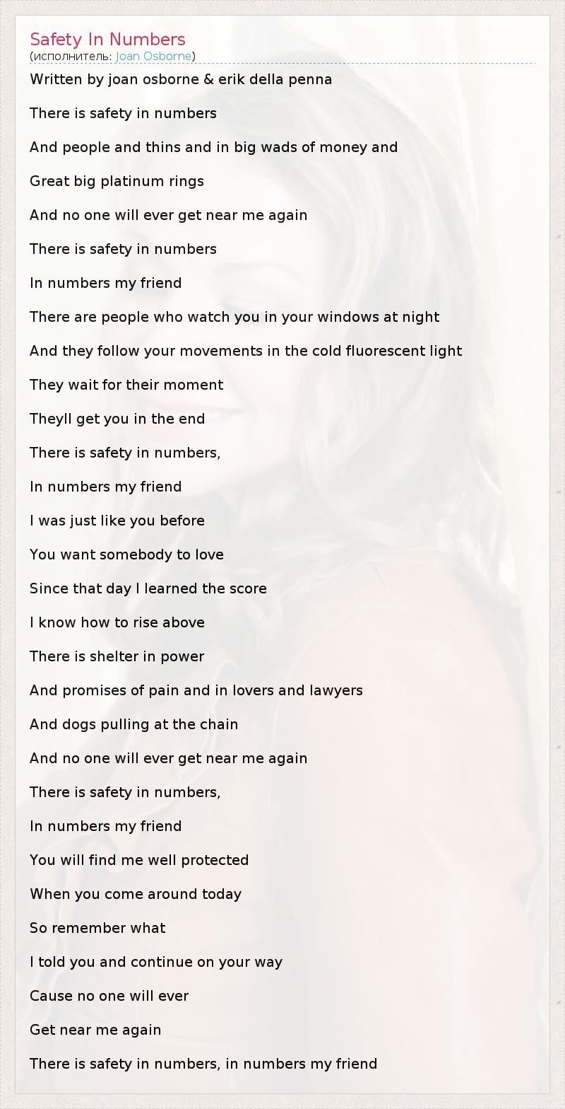 Written by joan osborne & erik della penna There is safety in numbers And people and thins and in big wads of money and Great big platinum rings And no one will ever get near me again There is safety in numbers In numbers my friend There are people who watch you in your windows at night And they follow your movements in the cold fluorescent light They wait for their moment Theyll get you in the end There is safety in numbers, In numbers my friend I was just like you before You want somebody to love Since that day I learned the score I know how to rise above There is shelter in power And promises of pain and in lovers and lawyers And dogs pulling at the chain And no one will ever get near me again There is safety in numbers, In numbers my friend You will find me well protected When you come around today So remember what I told you and continue on your way Cause no one will ever Get near me again There is safety in numbers, in numbers my friend