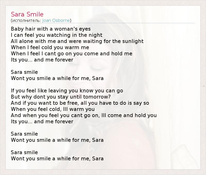 Baby hair with a woman's eyes I can feel you watching in the night All alone with me and were waiting for the sunlight When I feel cold you warm me When I feel I cant go on you come and hold me Its you... and me forever Sara smile Wont you smile a while for me, Sara If you feel like leaving you know you can go But why dont you stay until tomorrow? And if you want to be free, all you have to do is say so When you feel cold, Ill warm you And when you feel you cant go on, Ill come and hold you Its you... and me forever Sara smile Wont you smile a while for me, Sara Sara smile Wont you smile a while for me, Sara