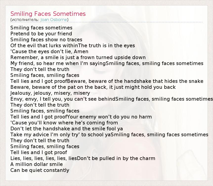 Smiling faces sometimes Pretend to be your friend Smiling faces show no traces Of the evil that lurks withinThe truth is in the eyes 'Cause the eyes don't lie, Amen Remember, a smile is just a frown turned upside down My friend, so hear me when I'm sayingSmiling faces, smiling faces sometimes They don't tell the truth Smiling faces, smiling faces Tell lies and I got proofBeware, beware of the handshake that hides the snake Beware, beware of the pat on the back, it just might hold you back Jealousy, jelousy, misery, misery Envy, envy, I tell you, you can't see behindSmiling faces, smiling faces sometimes They don't tell the truth Smiling faces, smiling faces Tell lies and I got proofYour enemy won't do you no harm 'Cause you'll know where he's coming from Don't let the handshake and the smile fool ya Take my advice I'm only try' to school yaSmiling faces, smiling faces sometimes They don't tell the truth Smiling faces, smiling faces Tell lies and I got proof Lies, lies, lies, lies, lies, liesDon't be pulled in by the charm A million dollar smile Can be quiet constantly