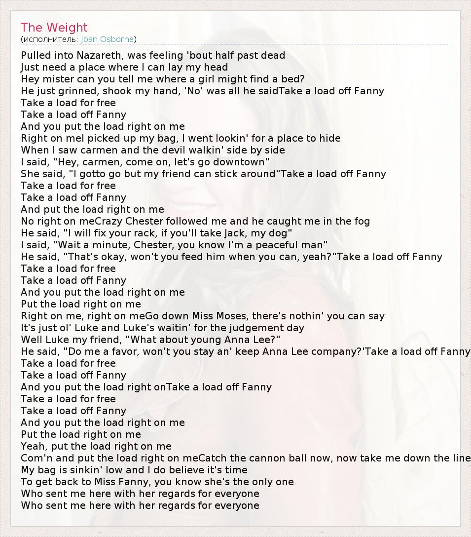 Pulled into Nazareth, was feeling 'bout half past dead Just need a place where I can lay my head Hey mister can you tell me where a girl might find a bed? He just grinned, shook my hand, 'No' was all he saidTake a load off Fanny Take a load for free Take a load off Fanny And you put the load right on me Right on meI picked up my bag, I went lookin' for a place to hide When I saw carmen and the devil walkin' side by side I said, "Hey, carmen, come on, let's go downtown" She said, "I gotto go but my friend can stick around"Take a load off Fanny Take a load for free Take a load off Fanny And put the load right on me No right on meCrazy Chester followed me and he caught me in the fog He said, "I will fix your rack, if you'll take Jack, my dog" I said, "Wait a minute, Chester, you know I'm a peaceful man" He said, "That's okay, won't you feed him when you can, yeah?"Take a load off Fanny Take a load for free Take a load off Fanny And you put the load right on me Put the load right on me Right on me, right on meGo down Miss Moses, there's nothin' you can say It's just ol' Luke and Luke's waitin' for the judgement day Well Luke my friend, "What about young Anna Lee?" He said, "Do me a favor, won't you stay an' keep Anna Lee company?'Take a load off Fanny Take a load for free Take a load off Fanny And you put the load right onTake a load off Fanny Take a load for free Take a load off Fanny And you put the load right on me Put the load right on me Yeah, put the load right on me Com'n and put the load right on meCatch the cannon ball now, now take me down the line My bag is sinkin' low and I do believe it's time To get back to Miss Fanny, you know she's the only one Who sent me here with her regards for everyone Who sent me here with her regards for everyone