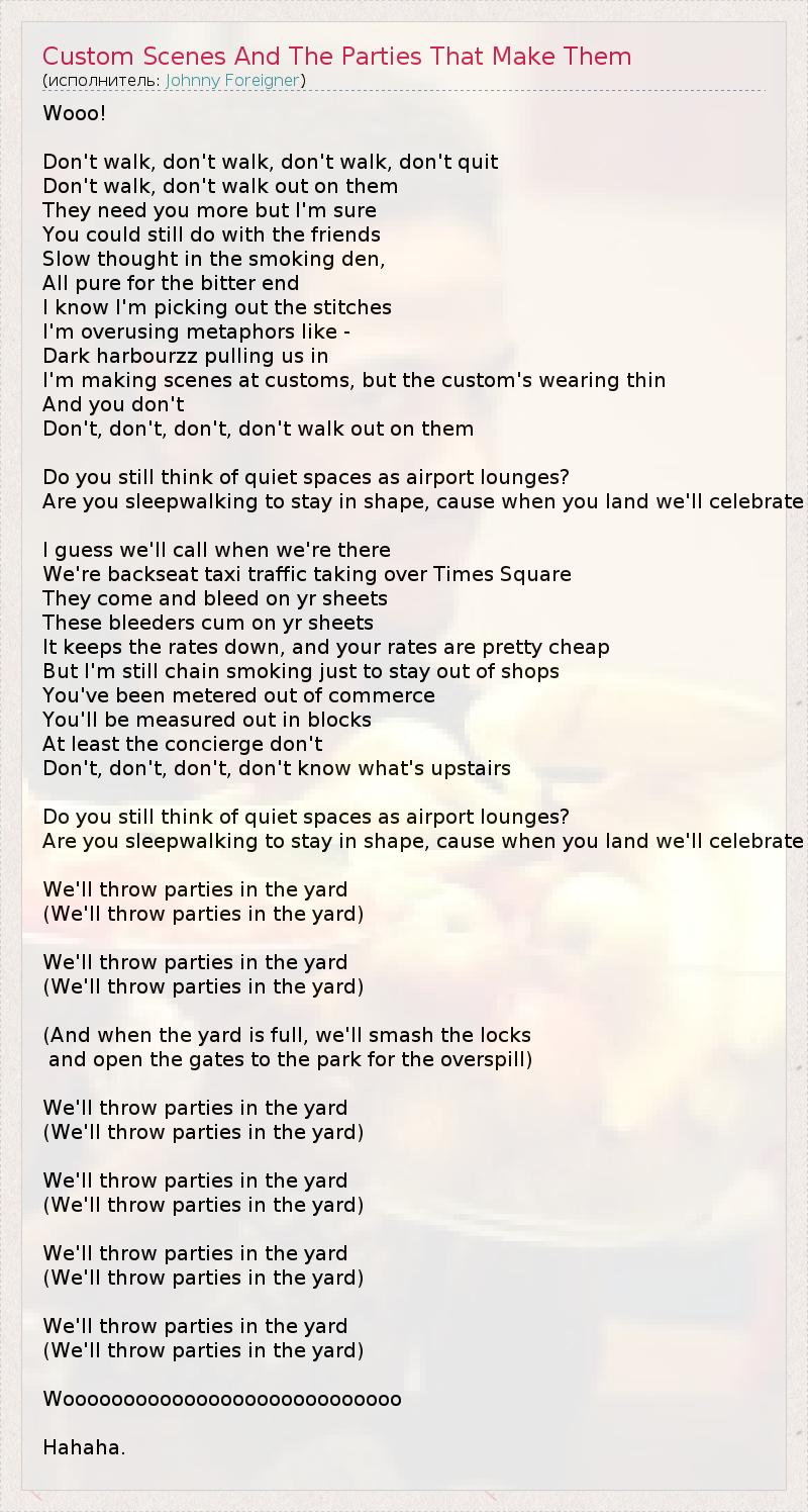 Wooo! Don't walk, don't walk, don't walk, don't quit Don't walk, don't walk out on them They need you more but I'm sure You could still do with the friends Slow thought in the smoking den, All pure for the bitter end I know I'm picking out the stitches I'm overusing metaphors like - Dark harbourzz pulling us in I'm making scenes at customs, but the custom's wearing thin And you don't Don't, don't, don't, don't walk out on them Do you still think of quiet spaces as airport lounges? Are you sleepwalking to stay in shape, cause when you land we'll celebrate I guess we'll call when we're there We're backseat taxi traffic taking over Times Square They come and bleed on yr sheets These bleeders cum on yr sheets It keeps the rates down, and your rates are pretty cheap But I'm still chain smoking just to stay out of shops You've been metered out of commerce You'll be measured out in blocks At least the concierge don't Don't, don't, don't, don't know what's upstairs Do you still think of quiet spaces as airport lounges? Are you sleepwalking to stay in shape, cause when you land we'll celebrate We'll throw parties in the yard (We'll throw parties in the yard) We'll throw parties in the yard (We'll throw parties in the yard) (And when the yard is full, we'll smash the locks and open the gates to the park for the overspill) We'll throw parties in the yard (We'll throw parties in the yard) We'll throw parties in the yard (We'll throw parties in the yard) We'll throw parties in the yard (We'll throw parties in the yard) We'll throw parties in the yard (We'll throw parties in the yard) Woooooooooooooooooooooooooooo Hahaha.