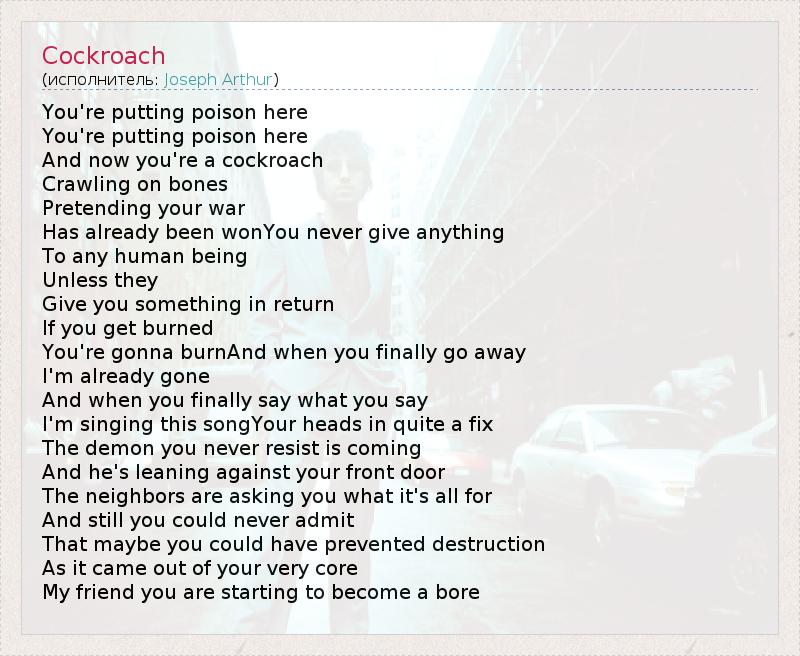 You're putting poison here You're putting poison here And now you're a cockroach Crawling on bones Pretending your war Has already been wonYou never give anything To any human being Unless they Give you something in return If you get burned You're gonna burnAnd when you finally go away I'm already gone And when you finally say what you say I'm singing this songYour heads in quite a fix The demon you never resist is coming And he's leaning against your front door The neighbors are asking you what it's all for And still you could never admit That maybe you could have prevented destruction As it came out of your very core My friend you are starting to become a bore