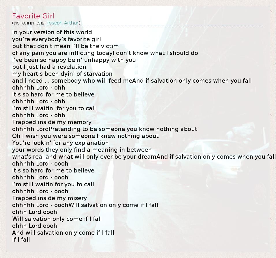 In your version of this world you're everybody's favorite girl but that don't mean I'll be the victim of any pain you are inflicting todayI don't know what I should do I've been so happy bein' unhappy with you but I just had a revelation my heart's been dyin' of starvation and I need ... somebody who will feed meAnd if salvation only comes when you fall ohhhhh Lord - ohh It's so hard for me to believe ohhhhh Lord - ohh I'm still waitin' for you to call ohhhhh Lord - ohh Trapped inside my memory ohhhhh LordPretending to be someone you know nothing about Oh I wish you were someone I knew nothing about You're lookin' for any explanation your words they only find a meaning in between what's real and what will only ever be your dreamAnd if salvation only comes when you fall ohhhhh Lord - oooh It's so hard for me to believe ohhhhh Lord - oooh I'm still waitin for you to call ohhhhh Lord - oooh Trapped inside my misery ohhhhh Lord - ooohWill salvation only come if I fall ohhh Lord oooh Will salvation only come if I fall ohhh Lord oooh And will salvation only come if I fall If I fall