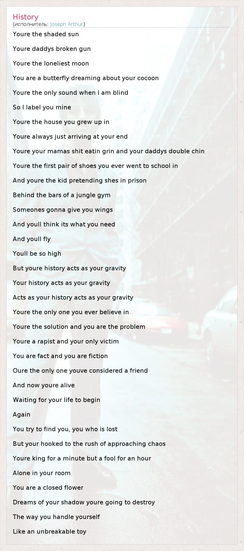 Youre the shaded sun Youre daddys broken gun Youre the loneliest moon You are a butterfly dreaming about your cocoon Youre the only sound when I am blind So I label you mine Youre the house you grew up in Youre always just arriving at your end Youre your mamas shit eatin grin and your daddys double chin Youre the first pair of shoes you ever went to school in And youre the kid pretending shes in prison Behind the bars of a jungle gym Someones gonna give you wings And youll think its what you need And youll fly Youll be so high But youre history acts as your gravity Your history acts as your gravity Acts as your history acts as your gravity Youre the only one you ever believe in Youre the solution and you are the problem Youre a rapist and your only victim You are fact and you are fiction Oure the only one youve considered a friend And now youre alive Waiting for your life to begin Again You try to find you, you who is lost But your hooked to the rush of approaching chaos Youre king for a minute but a fool for an hour Alone in your room You are a closed flower Dreams of your shadow youre going to destroy The way you handle yourself Like an unbreakable toy