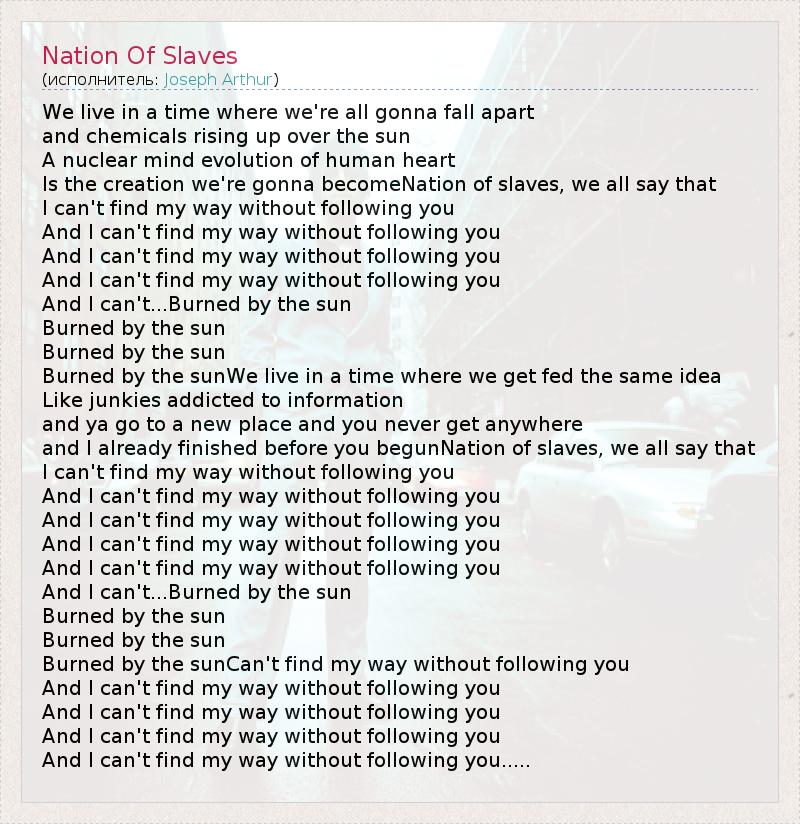 We live in a time where we're all gonna fall apart and chemicals rising up over the sun A nuclear mind evolution of human heart Is the creation we're gonna becomeNation of slaves, we all say that I can't find my way without following you And I can't find my way without following you And I can't find my way without following you And I can't find my way without following you And I can't...Burned by the sun Burned by the sun Burned by the sun Burned by the sunWe live in a time where we get fed the same idea Like junkies addicted to information and ya go to a new place and you never get anywhere and I already finished before you begunNation of slaves, we all say that I can't find my way without following you And I can't find my way without following you And I can't find my way without following you And I can't find my way without following you And I can't find my way without following you And I can't...Burned by the sun Burned by the sun Burned by the sun Burned by the sunCan't find my way without following you And I can't find my way without following you And I can't find my way without following you And I can't find my way without following you And I can't find my way without following you.....