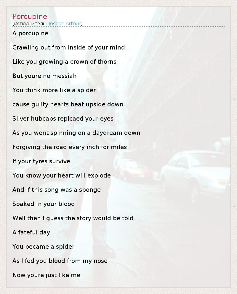 A porcupine Crawling out from inside of your mind Like you growing a crown of thorns But youre no messiah You think more like a spider cause guilty hearts beat upside down Silver hubcaps replcaed your eyes As you went spinning on a daydream down Forgiving the road every inch for miles If your tyres survive You know your heart will explode And if this song was a sponge Soaked in your blood Well then I guess the story would be told A fateful day You became a spider As I fed you blood from my nose Now youre just like me