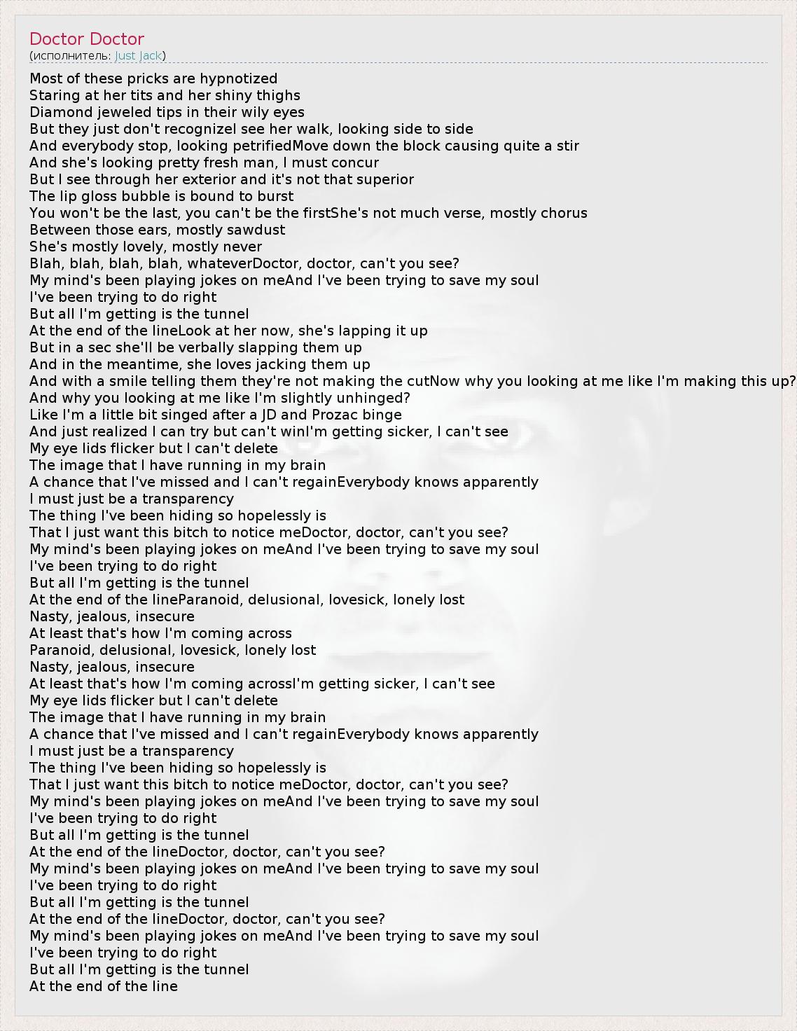 Most of these pricks are hypnotized Staring at her tits and her shiny thighs Diamond jeweled tips in their wily eyes But they just don't recognizeI see her walk, looking side to side And everybody stop, looking petrifiedMove down the block causing quite a stir And she's looking pretty fresh man, I must concur But I see through her exterior and it's not that superior The lip gloss bubble is bound to burst You won't be the last, you can't be the firstShe's not much verse, mostly chorus Between those ears, mostly sawdust She's mostly lovely, mostly never Blah, blah, blah, blah, whateverDoctor, doctor, can't you see? My mind's been playing jokes on meAnd I've been trying to save my soul I've been trying to do right But all I'm getting is the tunnel At the end of the lineLook at her now, she's lapping it up But in a sec she'll be verbally slapping them up And in the meantime, she loves jacking them up And with a smile telling them they're not making the cutNow why you looking at me like I'm making this up? And why you looking at me like I'm slightly unhinged? Like I'm a little bit singed after a JD and Prozac binge And just realized I can try but can't winI'm getting sicker, I can't see My eye lids flicker but I can't delete The image that I have running in my brain A chance that I've missed and I can't regainEverybody knows apparently I must just be a transparency The thing I've been hiding so hopelessly is That I just want this bitch to notice meDoctor, doctor, can't you see? My mind's been playing jokes on meAnd I've been trying to save my soul I've been trying to do right But all I'm getting is the tunnel At the end of the lineParanoid, delusional, lovesick, lonely lost Nasty, jealous, insecure At least that's how I'm coming across Paranoid, delusional, lovesick, lonely lost Nasty, jealous, insecure At least that's how I'm coming acrossI'm getting sicker, I can't see My eye lids flicker but I can't delete The image that I have running in my brain A chance that I've missed and I can't regainEverybody knows apparently I must just be a transparency The thing I've been hiding so hopelessly is That I just want this bitch to notice meDoctor, doctor, can't you see? My mind's been playing jokes on meAnd I've been trying to save my soul I've been trying to do right But all I'm getting is the tunnel At the end of the lineDoctor, doctor, can't you see? My mind's been playing jokes on meAnd I've been trying to save my soul I've been trying to do right But all I'm getting is the tunnel At the end of the lineDoctor, doctor, can't you see? My mind's been playing jokes on meAnd I've been trying to save my soul I've been trying to do right But all I'm getting is the tunnel At the end of the line