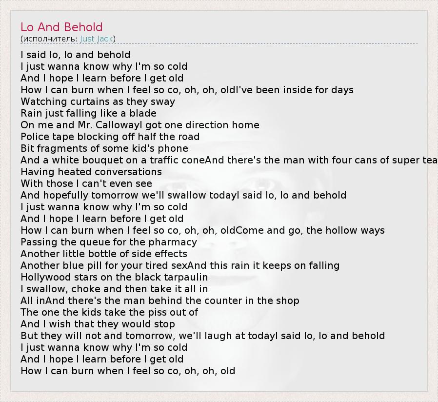 I said lo, lo and behold I just wanna know why I'm so cold And I hope I learn before I get old How I can burn when I feel so co, oh, oh, oldI've been inside for days Watching curtains as they sway Rain just falling like a blade On me and Mr. CallowayI got one direction home Police tape blocking off half the road Bit fragments of some kid's phone And a white bouquet on a traffic coneAnd there's the man with four cans of super tea Having heated conversations With those I can't even see And hopefully tomorrow we'll swallow todayI said lo, lo and behold I just wanna know why I'm so cold And I hope I learn before I get old How I can burn when I feel so co, oh, oh, oldCome and go, the hollow ways Passing the queue for the pharmacy Another little bottle of side effects Another blue pill for your tired sexAnd this rain it keeps on falling Hollywood stars on the black tarpaulin I swallow, choke and then take it all in All inAnd there's the man behind the counter in the shop The one the kids take the piss out of And I wish that they would stop But they will not and tomorrow, we'll laugh at todayI said lo, lo and behold I just wanna know why I'm so cold And I hope I learn before I get old How I can burn when I feel so co, oh, oh, old