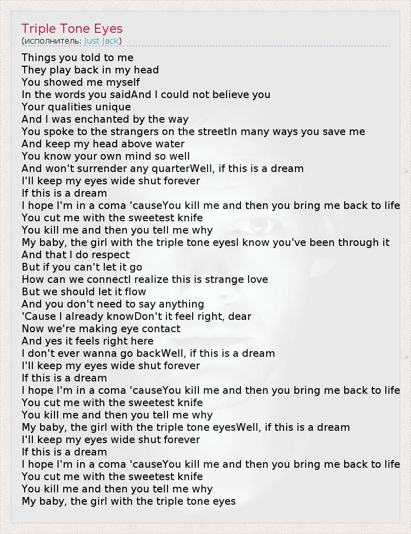 Things you told to me They play back in my head You showed me myself In the words you saidAnd I could not believe you Your qualities unique And I was enchanted by the way You spoke to the strangers on the streetIn many ways you save me And keep my head above water You know your own mind so well And won't surrender any quarterWell, if this is a dream I'll keep my eyes wide shut forever If this is a dream I hope I'm in a coma 'causeYou kill me and then you bring me back to life You cut me with the sweetest knife You kill me and then you tell me why My baby, the girl with the triple tone eyesI know you've been through it And that I do respect But if you can't let it go How can we connectI realize this is strange love But we should let it flow And you don't need to say anything 'Cause I already knowDon't it feel right, dear Now we're making eye contact And yes it feels right here I don't ever wanna go backWell, if this is a dream I'll keep my eyes wide shut forever If this is a dream I hope I'm in a coma 'causeYou kill me and then you bring me back to life You cut me with the sweetest knife You kill me and then you tell me why My baby, the girl with the triple tone eyesWell, if this is a dream I'll keep my eyes wide shut forever If this is a dream I hope I'm in a coma 'causeYou kill me and then you bring me back to life You cut me with the sweetest knife You kill me and then you tell me why My baby, the girl with the triple tone eyes