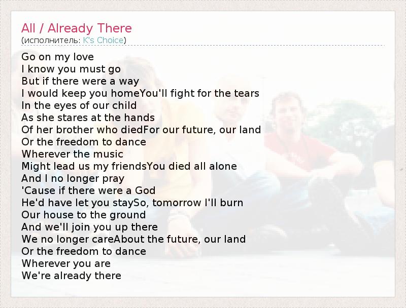 Это интересно:K’s Choice - бельгийская рок-группа из Антверпена. Их стиль можно охарактеризовать как гитарный рок, или фолк-рок.Состав:Сара Беттенс - вокал, гитара.Герт Беттенс - гитара, клавишные, вокал.Эрик Гроссман - бас-гитара.Ян ван Сихем младший - гитара.Коен Лиекенс - ударные.В настоящий момент участники группы работают над сольным проектами. Сара Беттенс выпустила альбом под... продолжение