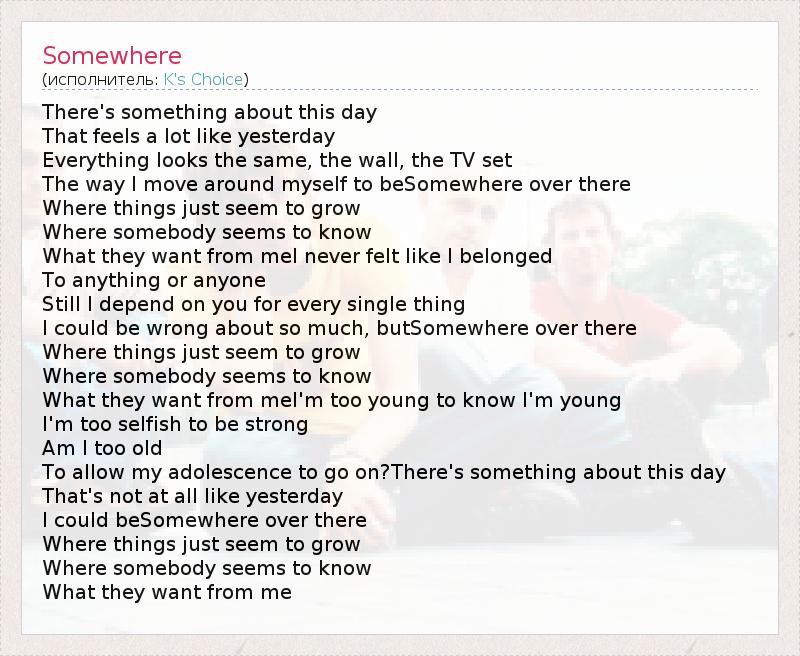 There's something about this day That feels a lot like yesterday Everything looks the same, the wall, the TV set The way I move around myself to beSomewhere over there Where things just seem to grow Where somebody seems to know What they want from meI never felt like I belonged To anything or anyone Still I depend on you for every single thing I could be wrong about so much, butSomewhere over there Where things just seem to grow Where somebody seems to know What they want from meI'm too young to know I'm young I'm too selfish to be strong Am I too old To allow my adolescence to go on?There's something about this day That's not at all like yesterday I could beSomewhere over there Where things just seem to grow Where somebody seems to know What they want from me