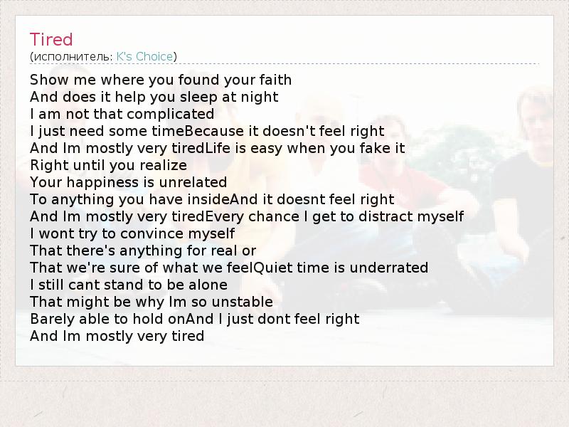 Это интересно:K’s Choice - бельгийская рок-группа из Антверпена. Их стиль можно охарактеризовать как гитарный рок, или фолк-рок.Состав:Сара Беттенс - вокал, гитара.Герт Беттенс - гитара, клавишные, вокал.Эрик Гроссман - бас-гитара.Ян ван Сихем младший - гитара.Коен Лиекенс - ударные.В настоящий момент участники группы работают над сольным проектами. Сара Беттенс выпустила альбом под... продолжение