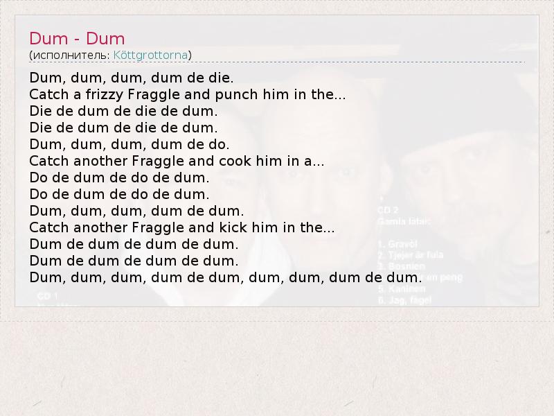 Dum, dum, dum, dum de die. Catch a frizzy Fraggle and punch him in the... Die de dum de die de dum. Die de dum de die de dum. Dum, dum, dum, dum de do. Catch another Fraggle and cook him in a... Do de dum de do de dum. Do de dum de do de dum. Dum, dum, dum, dum de dum. Catch another Fraggle and kick him in the... Dum de dum de dum de dum. Dum de dum de dum de dum. Dum, dum, dum, dum de dum, dum, dum, dum de dum.