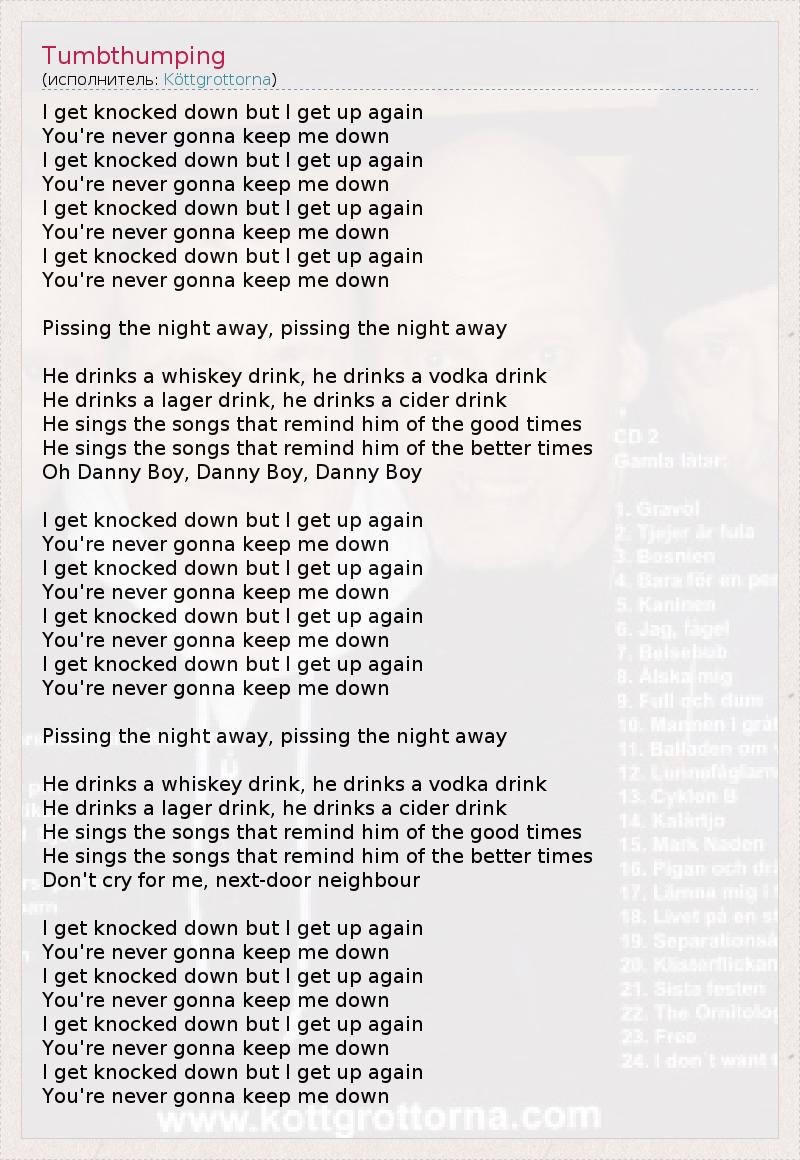 I get knocked down but I get up again You're never gonna keep me down I get knocked down but I get up again You're never gonna keep me down I get knocked down but I get up again You're never gonna keep me down I get knocked down but I get up again You're never gonna keep me down Pissing the night away, pissing the night away He drinks a whiskey drink, he drinks a vodka drink He drinks a lager drink, he drinks a cider drink He sings the songs that remind him of the good times He sings the songs that remind him of the better times Oh Danny Boy, Danny Boy, Danny Boy I get knocked down but I get up again You're never gonna keep me down I get knocked down but I get up again You're never gonna keep me down I get knocked down but I get up again You're never gonna keep me down I get knocked down but I get up again You're never gonna keep me down Pissing the night away, pissing the night away He drinks a whiskey drink, he drinks a vodka drink He drinks a lager drink, he drinks a cider drink He sings the songs that remind him of the good times He sings the songs that remind him of the better times Don't cry for me, next-door neighbour I get knocked down but I get up again You're never gonna keep me down I get knocked down but I get up again You're never gonna keep me down I get knocked down but I get up again You're never gonna keep me down I get knocked down but I get up again You're never gonna keep me down