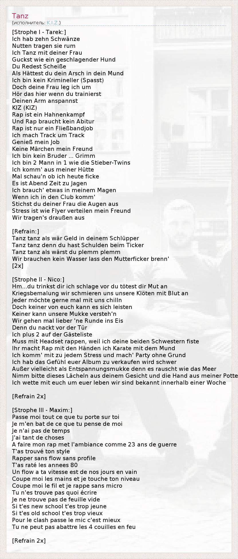 [Strophe I - Tarek:] Ich hab zehn Schwänze Nutten tragen sie rum Ich Tanz mit deiner Frau Guckst wie ein geschlagender Hund Du Redest Scheiße Als Hättest du dein Arsch in dein Mund Ich bin kein Krimineller (Spasst) Doch deine Frau leg ich um Hör das hier wenn du trainierst Deinen Arm anspannst KIZ (KIZ) Rap ist ein Hahnenkampf Und Rap braucht kein Abitur Rap ist nur ein Fließbandjob Ich mach Track um Track Genieß mein Job Keine Märchen mein Freund Ich bin kein Bruder ... Grimm Ich bin 2 Mann in 1 wie die Stieber-Twins Ich komm' aus meiner Hütte Mal schau'n ob ich heute ficke Es ist Abend Zeit zu Jagen Ich brauch' etwas in meinem Magen Wenn ich in den Club komm' Stichst du deiner Frau die Augen aus Stress ist wie Flyer verteilen mein Freund Wir tragen's draußen aus [Refrain:] Tanz tanz als wär Geld in deinem Schlüpper Tanz tanz denn du hast Schulden beim Ticker Tanz tanz als wärst du plemm plemm Wir brauchen kein Wasser lass den Mutterficker brenn' [2x] [Strophe II - Nico:] Hm...du trinkst dir ich schlage vor du tötest dir Mut an Kriegsbemalung wir schmieren uns unsere Klöten mit Blut an Jeder möchte gerne mal mit uns chilln Doch keiner von euch kann es sich leisten Keiner kann unsere Mukke versteh'n Wir gehen mal lieber 'ne Runde ins Eis Denn du nackt vor der Tür Ich plus 2 auf der Gästeliste Muss mit Headset rappen, weil ich deine beiden Schwestern fiste Ihr macht Rap mit den Händen ich Karate mit dem Mund Ich komm' mit zu jedem Stress und mach' Party ohne Grund Ich hab das Gefühl euer Album zu verkaufen wird schwer Außer vielleicht als Entspannungsmukke denn es rauscht wie das Meer Nimm bitte dieses Lächeln aus deinem Gesicht und die Hand aus meiner Potte Ich wette mit euch um euer leben wir sind bekannt innerhalb einer Woche [Refrain 2x] [Strophe III - Maxim:] Passe moi tout ce que tu porte sur toi Je m'en bat de ce que tu pense de moi Je n'ai pas de temps J'ai tant de choses A faire mon rap met l'ambiance comme 23 ans de guerre T'as trouvé ton style Rapper sans flow sans profile T'as raté les annees 80 Un flow a ta vitesse est de nos jours en vain Coupe moi les mains et je touche ton niveau Coupe moi le fil et je rappe sans micro Tu n'es trouve pas quoi écrire Je ne trouve pas de feuille vide Si t'es new school t'es trop jeune Si t'es old school t'es trop vieux Pour le clash passe le mic c'est mieux Tu ne peut pas abattre les 4 couilles en feu [Refrain 2x]