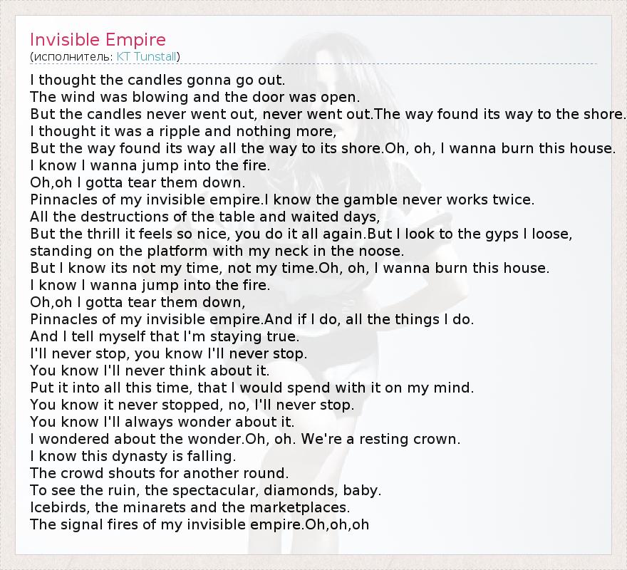 I thought the candles gonna go out. The wind was blowing and the door was open. But the candles never went out, never went out.The way found its way to the shore. I thought it was a ripple and nothing more, But the way found its way all the way to its shore.Oh, oh, I wanna burn this house. I know I wanna jump into the fire. Oh,oh I gotta tear them down. Pinnacles of my invisible empire.I know the gamble never works twice. All the destructions of the table and waited days, But the thrill it feels so nice, you do it all again.But I look to the gyps I loose, standing on the platform with my neck in the noose. But I know its not my time, not my time.Oh, oh, I wanna burn this house. I know I wanna jump into the fire. Oh,oh I gotta tear them down, Pinnacles of my invisible empire.And if I do, all the things I do. And I tell myself that I'm staying true. I'll never stop, you know I'll never stop. You know I'll never think about it. Put it into all this time, that I would spend with it on my mind. You know it never stopped, no, I'll never stop. You know I'll always wonder about it. I wondered about the wonder.Oh, oh. We're a resting crown. I know this dynasty is falling. The crowd shouts for another round. To see the ruin, the spectacular, diamonds, baby. Icebirds, the minarets and the marketplaces. The signal fires of my invisible empire.Oh,oh,oh