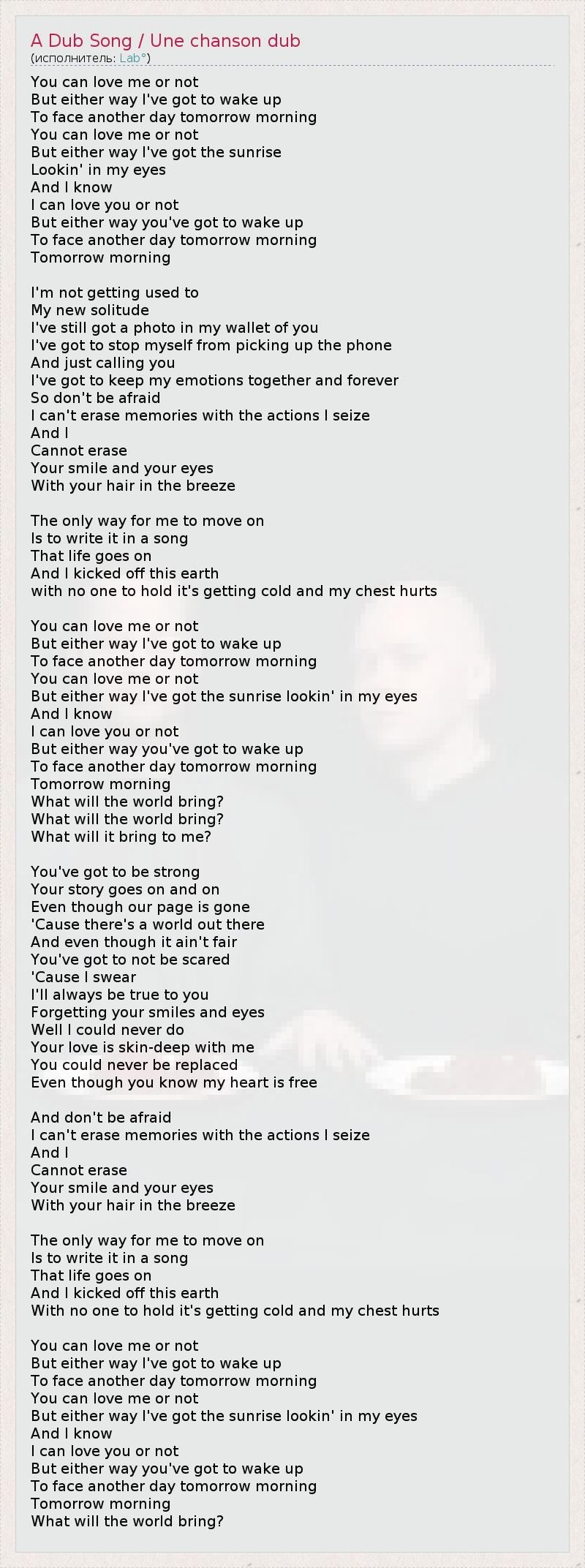 You can love me or not But either way I've got to wake up To face another day tomorrow morning You can love me or not But either way I've got the sunrise Lookin' in my eyes And I know I can love you or not But either way you've got to wake up To face another day tomorrow morning Tomorrow morning I'm not getting used to My new solitude I've still got a photo in my wallet of you I've got to stop myself from picking up the phone And just calling you I've got to keep my emotions together and forever So don't be afraid I can't erase memories with the actions I seize And I Cannot erase Your smile and your eyes With your hair in the breeze The only way for me to move on Is to write it in a song That life goes on And I kicked off this earth with no one to hold it's getting cold and my chest hurts You can love me or not But either way I've got to wake up To face another day tomorrow morning You can love me or not But either way I've got the sunrise lookin' in my eyes And I know I can love you or not But either way you've got to wake up To face another day tomorrow morning Tomorrow morning What will the world bring? What will the world bring? What will it bring to me? You've got to be strong Your story goes on and on Even though our page is gone 'Cause there's a world out there And even though it ain't fair You've got to not be scared 'Cause I swear I'll always be true to you Forgetting your smiles and eyes Well I could never do Your love is skin-deep with me You could never be replaced Even though you know my heart is free And don't be afraid I can't erase memories with the actions I seize And I Cannot erase Your smile and your eyes With your hair in the breeze The only way for me to move on Is to write it in a song That life goes on And I kicked off this earth With no one to hold it's getting cold and my chest hurts You can love me or not But either way I've got to wake up To face another day tomorrow morning You can love me or not But either way I've got the sunrise lookin' in my eyes And I know I can love you or not But either way you've got to wake up To face another day tomorrow morning Tomorrow morning What will the world bring?