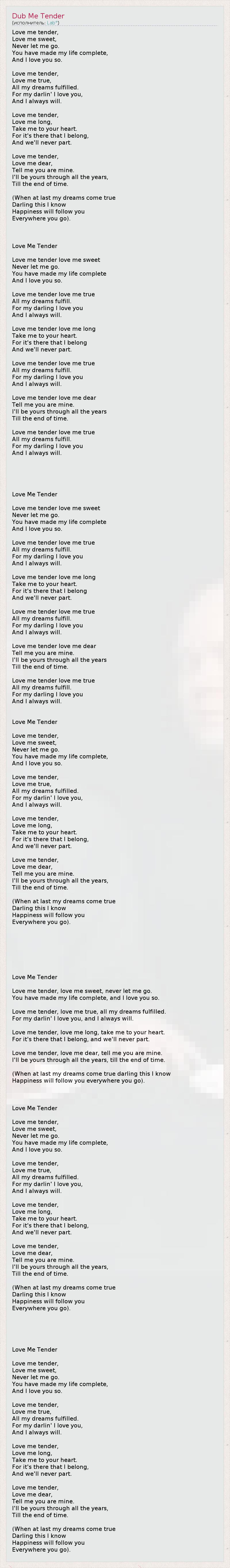 Love me tender, Love me sweet, Never let me go. You have made my life complete, And I love you so. Love me tender, Love me true, All my dreams fulfilled. For my darlin' I love you, And I always will. Love me tender, Love me long, Take me to your heart. For it's there that I belong, And we'll never part. Love me tender, Love me dear, Tell me you are mine. I'll be yours through all the years, Till the end of time. (When at last my dreams come true Darling this I know Happiness will follow you Everywhere you go). Love Me Tender Love me tender love me sweet Never let me go. You have made my life complete And I love you so. Love me tender love me true All my dreams fulfill. For my darling I love you And I always will. Love me tender love me long Take me to your heart. For it's there that I belong And we'll never part. Love me tender love me true All my dreams fulfill. For my darling I love you And I always will. Love me tender love me dear Tell me you are mine. I'll be yours through all the years Till the end of time. Love me tender love me true All my dreams fulfill. For my darling I love you And I always will. Love Me Tender Love me tender love me sweet Never let me go. You have made my life complete And I love you so. Love me tender love me true All my dreams fulfill. For my darling I love you And I always will. Love me tender love me long Take me to your heart. For it's there that I belong And we'll never part. Love me tender love me true All my dreams fulfill. For my darling I love you And I always will. Love me tender love me dear Tell me you are mine. I'll be yours through all the years Till the end of time. Love me tender love me true All my dreams fulfill. For my darling I love you And I always will. Love Me Tender Love me tender, Love me sweet, Never let me go. You have made my life complete, And I love you so. Love me tender, Love me true, All my dreams fulfilled. For my darlin' I love you, And I always will. Love me tender, Love me long, Take me to your heart. For it's there that I belong, And we'll never part. Love me tender, Love me dear, Tell me you are mine. I'll be yours through all the years, Till the end of time. (When at last my dreams come true Darling this I know Happiness will follow you Everywhere you go). Love Me Tender Love me tender, love me sweet, never let me go. You have made my life complete, and I love you so. Love me tender, love me true, all my dreams fulfilled. For my darlin' I love you, and I always will. Love me tender, love me long, take me to your heart. For it's there that I belong, and we'll never part. Love me tender, love me dear, tell me you are mine. I'll be yours through all the years, till the end of time. (When at last my dreams come true darling this I know Happiness will follow you everywhere you go). Love Me Tender Love me tender, Love me sweet, Never let me go. You have made my life complete, And I love you so. Love me tender, Love me true, All my dreams fulfilled. For my darlin' I love you, And I always will. Love me tender, Love me long, Take me to your heart. For it's there that I belong, And we'll never part. Love me tender, Love me dear, Tell me you are mine. I'll be yours through all the years, Till the end of time. (When at last my dreams come true Darling this I know Happiness will follow you Everywhere you go). Love Me Tender Love me tender, Love me sweet, Never let me go. You have made my life complete, And I love you so. Love me tender, Love me true, All my dreams fulfilled. For my darlin' I love you, And I always will. Love me tender, Love me long, Take me to your heart. For it's there that I belong, And we'll never part. Love me tender, Love me dear, Tell me you are mine. I'll be yours through all the years, Till the end of time. (When at last my dreams come true Darling this I know Happiness will follow you Everywhere you go).