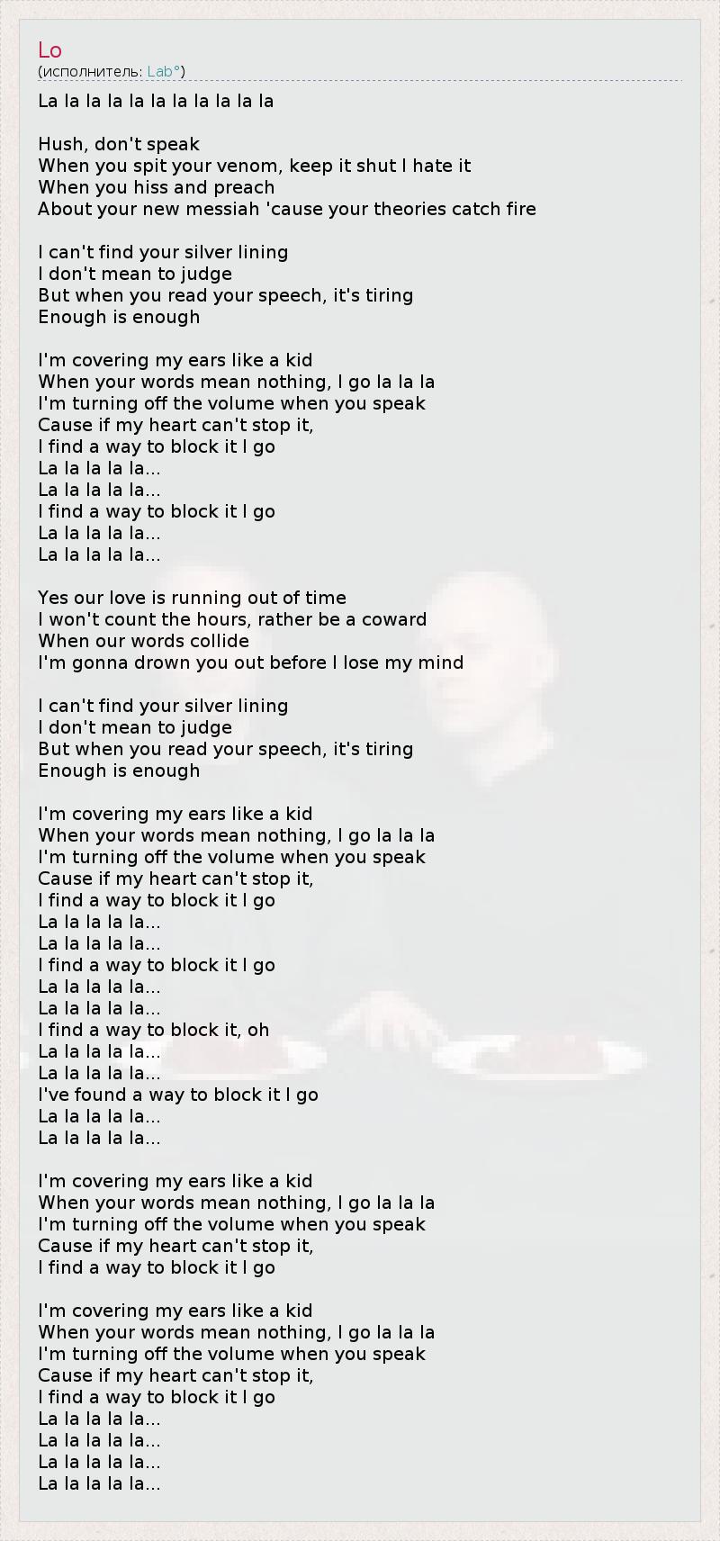 La la la la la la la la la la la Hush, don't speak When you spit your venom, keep it shut I hate it When you hiss and preach About your new messiah 'cause your theories catch fire I can't find your silver lining I don't mean to judge But when you read your speech, it's tiring Enough is enough I'm covering my ears like a kid When your words mean nothing, I go la la la I'm turning off the volume when you speak Cause if my heart can't stop it, I find a way to block it I go La la la la la... La la la la la... I find a way to block it I go La la la la la... La la la la la... Yes our love is running out of time I won't count the hours, rather be a coward When our words collide I'm gonna drown you out before I lose my mind I can't find your silver lining I don't mean to judge But when you read your speech, it's tiring Enough is enough I'm covering my ears like a kid When your words mean nothing, I go la la la I'm turning off the volume when you speak Cause if my heart can't stop it, I find a way to block it I go La la la la la... La la la la la... I find a way to block it I go La la la la la... La la la la la... I find a way to block it, oh La la la la la... La la la la la... I've found a way to block it I go La la la la la... La la la la la... I'm covering my ears like a kid When your words mean nothing, I go la la la I'm turning off the volume when you speak Cause if my heart can't stop it, I find a way to block it I go I'm covering my ears like a kid When your words mean nothing, I go la la la I'm turning off the volume when you speak Cause if my heart can't stop it, I find a way to block it I go La la la la la... La la la la la... La la la la la... La la la la la...