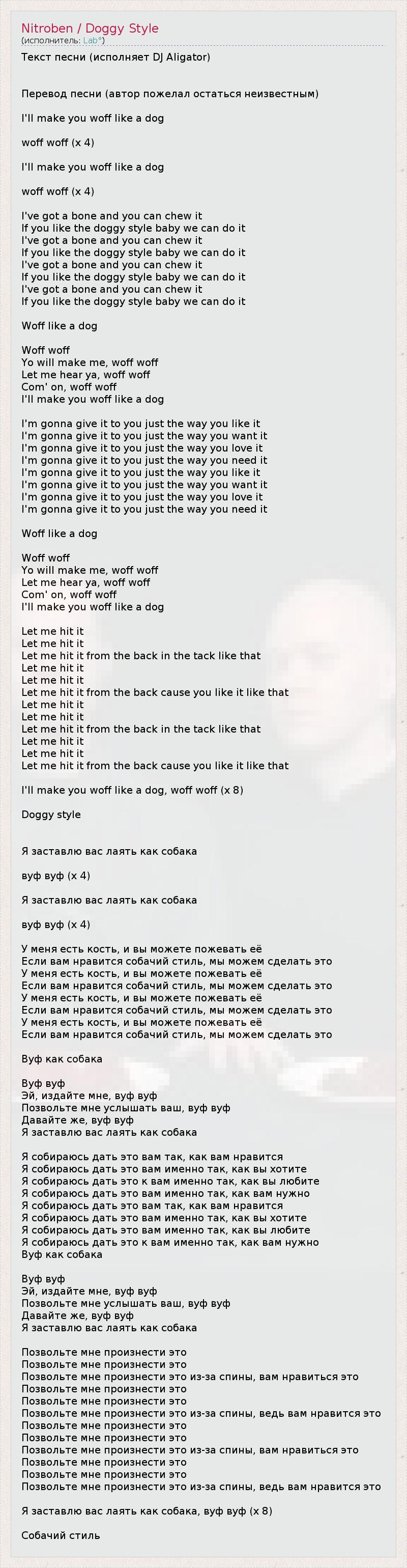 Текст песни (исполняет DJ Aligator) Перевод песни (автор пожелал остаться неизвестным) I'll make you woff like a dog woff woff (x 4) I'll make you woff like a dog woff woff (x 4) I've got a bone and you can chew it If you like the doggy style baby we can do it I've got a bone and you can chew it If you like the doggy style baby we can do it I've got a bone and you can chew it If you like the doggy style baby we can do it I've got a bone and you can chew it If you like the doggy style baby we can do it Woff like a dog Woff woff Yo will make me, woff woff Let me hear ya, woff woff Com' on, woff woff I'll make you woff like a dog I'm gonna give it to you just the way you like it I'm gonna give it to you just the way you want it I'm gonna give it to you just the way you love it I'm gonna give it to you just the way you need it I'm gonna give it to you just the way you like it I'm gonna give it to you just the way you want it I'm gonna give it to you just the way you love it I'm gonna give it to you just the way you need it Woff like a dog Woff woff Yo will make me, woff woff Let me hear ya, woff woff Com' on, woff woff I'll make you woff like a dog Let me hit it Let me hit it Let me hit it from the back in the tack like that Let me hit it Let me hit it Let me hit it from the back cause you like it like that Let me hit it Let me hit it Let me hit it from the back in the tack like that Let me hit it Let me hit it Let me hit it from the back cause you like it like that I'll make you woff like a dog, woff woff (x 8) Doggy style Я заставлю вас лаять как собака вуф вуф (x 4) Я заставлю вас лаять как собака вуф вуф (x 4) У меня есть кость, и вы можете пожевать её Если вам нравится собачий стиль, мы можем сделать это У меня есть кость, и вы можете пожевать её Если вам нравится собачий стиль, мы можем сделать это У меня есть кость, и вы можете пожевать её Если вам нравится собачий стиль, мы можем сделать это У меня есть кость, и вы можете пожевать её Если вам нравится собачий стиль, мы можем сделать это Вуф как собака Вуф вуф Эй, издайте мне, вуф вуф Позвольте мне услышать ваш, вуф вуф Давайте же, вуф вуф Я заставлю вас лаять как собака Я собираюсь дать это вам так, как вам нравится Я собираюсь дать это вам именно так, как вы хотите Я собираюсь дать это к вам именно так, как вы любите Я собираюсь дать это вам именно так, как вам нужно Я собираюсь дать это вам так, как вам нравится Я собираюсь дать это вам именно так, как вы хотите Я собираюсь дать это вам именно так, как вы любите Я собираюсь дать это к вам именно так, как вам нужно Вуф как собака Вуф вуф Эй, издайте мне, вуф вуф Позвольте мне услышать ваш, вуф вуф Давайте же, вуф вуф Я заставлю вас лаять как собака Позвольте мне произнести это Позвольте мне произнести это Позвольте мне произнести это из-за спины, вам нравиться это Позвольте мне произнести это Позвольте мне произнести это Позвольте мне произнести это из-за спины, ведь вам нравится это Позвольте мне произнести это Позвольте мне произнести это Позвольте мне произнести это из-за спины, вам нравиться это Позвольте мне произнести это Позвольте мне произнести это Позвольте мне произнести это из-за спины, ведь вам нравится это Я заставлю вас лаять как собака, вуф вуф (x 8) Собачий стиль