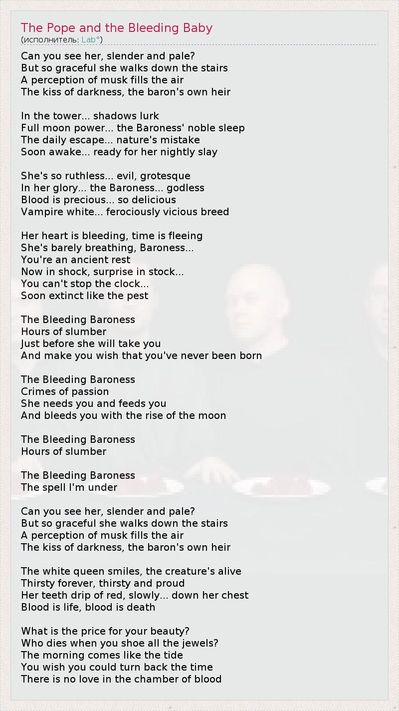 Смотри, это она, такая тонкая и бледная, Но как грациозно она спускается по лестнице. Аромат мускуса наполняет воздух, Поцелуй темноты, наследница барона. В башне... Тени скрывают Всю мощь луны... Благородный сон Баронессы - Ежедневное спасение... Ошибка природы Скоро проснется... Готовая к еженощному убийству. Она так безжалостна... Зло, гротеск Во славу ее... Баронесса... безбожна, Кровь бесценна... так вкусна Вампирски-бледная... Жестокой и порочной породы. Ее сердце кровоточит, время истекает, Она едва дышит, Баронесса... Твой вечный покой. Сейчас шокирована, удивлена, Ты не остановишь время, Скоро исчезнешь, как паразит. Кровавая Баронесса, Часы во дреме, Прямо перед тем как она заберет тебя И заставит тебя пожалеть о том, что родился на свет. Кровавая Баронесса, Преступления страсти, Она нуждается в тебе, она питается тобой, Она выпускает твою кровь с восходом луны. Кровавая Баронесса, Часы во дреме. Кровавая Баронесса, Я под властью ее чар. Смотри, это она, такая тонкая и бледная, Но как грациозно она спускается по лестнице. Аромат мускуса наполняет воздух, Поцелуй темноты, наследница барона. Белая королева улыбается, тварь жива. Жажда навечно, жажда и гордость. С ее клыков капает красное... на ее грудь. Кровь - это жизнь, кровь - это смерть. Какова цена твоей красоты, Кто умирает, когда ты надеваешь все эти украшения? Утро наступает, как половодье. Ты хотел бы повернуть время вспять, В комнате крови нет любви.
