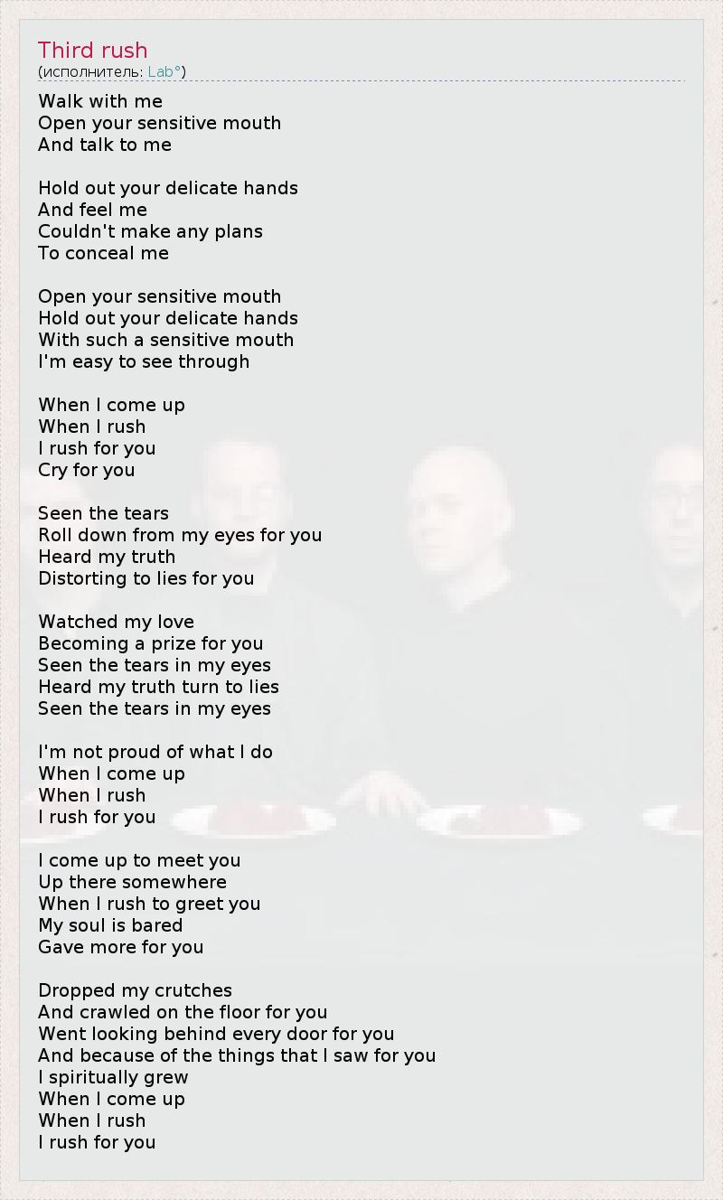 Walk with me Open your sensitive mouth And talk to me Hold out your delicate hands And feel me Couldn't make any plans To conceal me Open your sensitive mouth Hold out your delicate hands With such a sensitive mouth I'm easy to see through When I come up When I rush I rush for you Cry for you Seen the tears Roll down from my eyes for you Heard my truth Distorting to lies for you Watched my love Becoming a prize for you Seen the tears in my eyes Heard my truth turn to lies Seen the tears in my eyes I'm not proud of what I do When I come up When I rush I rush for you I come up to meet you Up there somewhere When I rush to greet you My soul is bared Gave more for you Dropped my crutches And crawled on the floor for you Went looking behind every door for you And because of the things that I saw for you I spiritually grew When I come up When I rush I rush for you