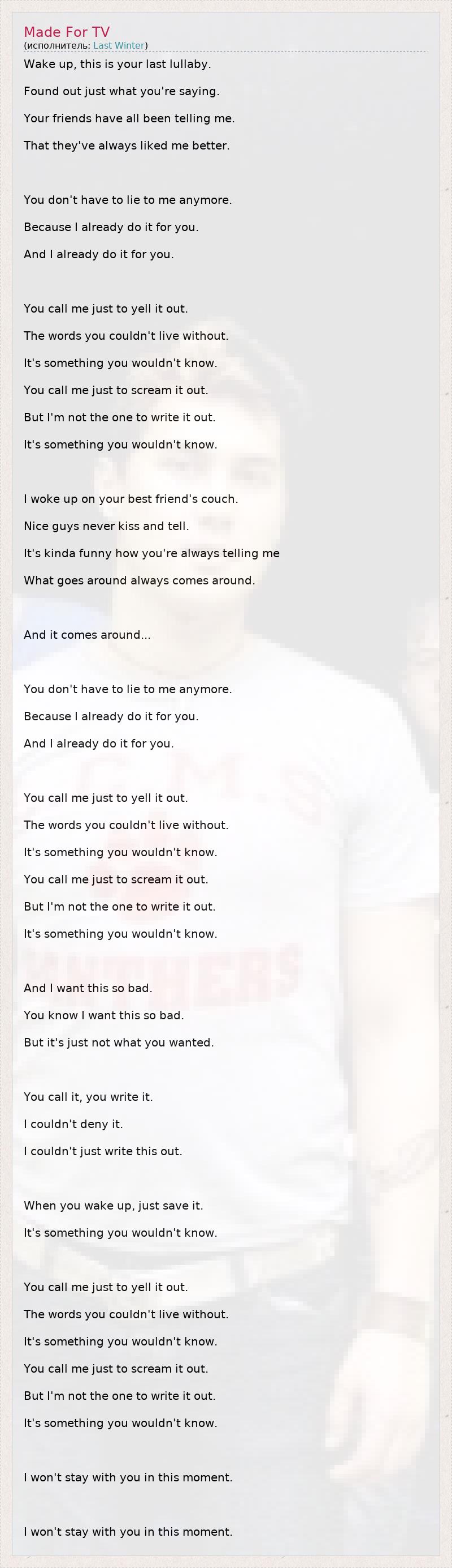 Wake up, this is your last lullaby. Found out just what you're saying. Your friends have all been telling me. That they've always liked me better. You don't have to lie to me anymore. Because I already do it for you. And I already do it for you. You call me just to yell it out. The words you couldn't live without. It's something you wouldn't know. You call me just to scream it out. But I'm not the one to write it out. It's something you wouldn't know. I woke up on your best friend's couch. Nice guys never kiss and tell. It's kinda funny how you're always telling me What goes around always comes around. And it comes around... You don't have to lie to me anymore. Because I already do it for you. And I already do it for you. You call me just to yell it out. The words you couldn't live without. It's something you wouldn't know. You call me just to scream it out. But I'm not the one to write it out. It's something you wouldn't know. And I want this so bad. You know I want this so bad. But it's just not what you wanted. You call it, you write it. I couldn't deny it. I couldn't just write this out. When you wake up, just save it. It's something you wouldn't know. You call me just to yell it out. The words you couldn't live without. It's something you wouldn't know. You call me just to scream it out. But I'm not the one to write it out. It's something you wouldn't know. I won't stay with you in this moment. I won't stay with you in this moment.
