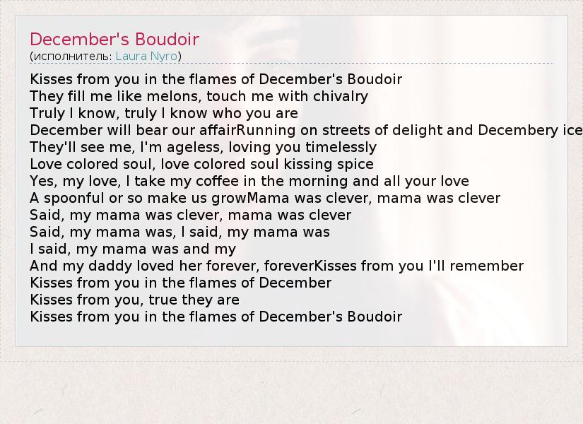 Kisses from you in the flames of December's Boudoir They fill me like melons, touch me with chivalry Truly I know, truly I know who you are December will bear our affairRunning on streets of delight and Decembery ice They'll see me, I'm ageless, loving you timelessly Love colored soul, love colored soul kissing spice Yes, my love, I take my coffee in the morning and all your love A spoonful or so make us growMama was clever, mama was clever Said, my mama was clever, mama was clever Said, my mama was, I said, my mama was I said, my mama was and my And my daddy loved her forever, foreverKisses from you I'll remember Kisses from you in the flames of December Kisses from you, true they are Kisses from you in the flames of December's Boudoir