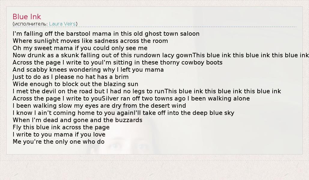 I'm falling off the barstool mama in this old ghost town saloon Where sunlight moves like sadness across the room Oh my sweet mama if you could only see me Now drunk as a skunk falling out of this rundown lacy gownThis blue ink this blue ink this blue ink Across the page I write to youI'm sitting in these thorny cowboy boots And scabby knees wondering why I left you mama Just to do as I please no hat has a brim Wide enough to block out the blazing sun I met the devil on the road but I had no legs to runThis blue ink this blue ink this blue ink Across the page I write to youSilver ran off two towns ago I been walking alone I been walking slow my eyes are dry from the desert wind I know I ain't coming home to you againI'll take off into the deep blue sky When I'm dead and gone and the buzzards Fly this blue ink across the page I write to you mama if you love Me you're the only one who do