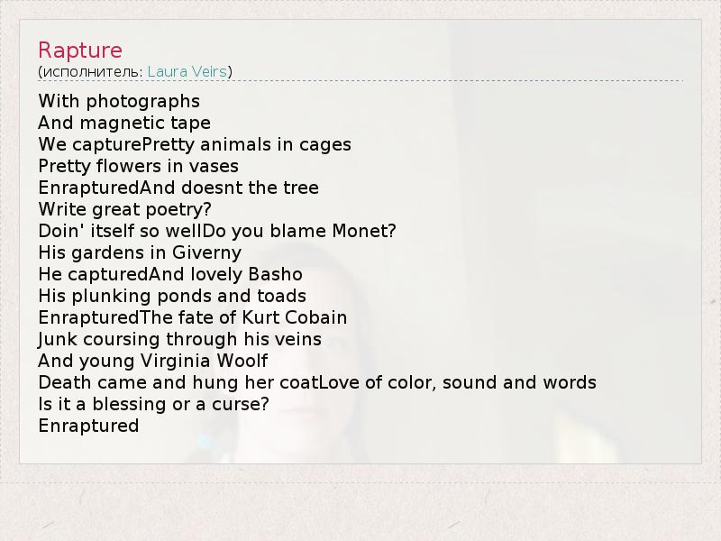 With photographs And magnetic tape We capturePretty animals in cages Pretty flowers in vases EnrapturedAnd doesnt the tree Write great poetry? Doin' itself so wellDo you blame Monet? His gardens in Giverny He capturedAnd lovely Basho His plunking ponds and toads EnrapturedThe fate of Kurt Cobain Junk coursing through his veins And young Virginia Woolf Death came and hung her coatLove of color, sound and words Is it a blessing or a curse? Enraptured