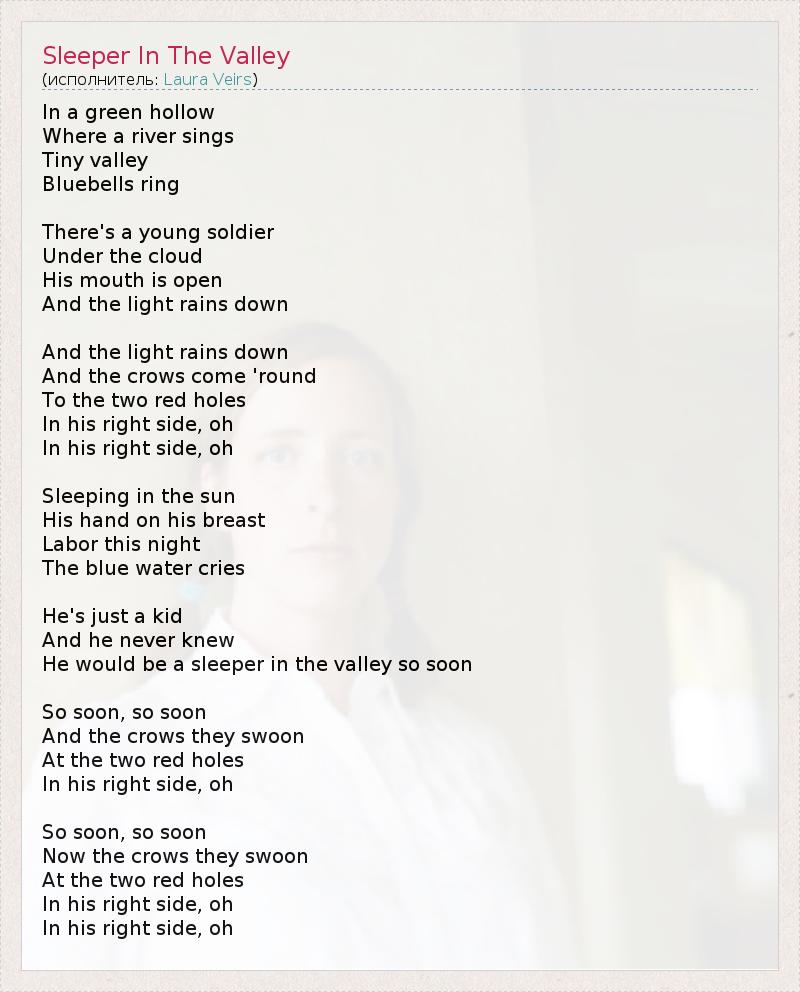 In a green hollow Where a river sings Tiny valley Bluebells ring There's a young soldier Under the cloud His mouth is open And the light rains down And the light rains down And the crows come 'round To the two red holes In his right side, oh In his right side, oh Sleeping in the sun His hand on his breast Labor this night The blue water cries He's just a kid And he never knew He would be a sleeper in the valley so soon So soon, so soon And the crows they swoon At the two red holes In his right side, oh So soon, so soon Now the crows they swoon At the two red holes In his right side, oh In his right side, oh