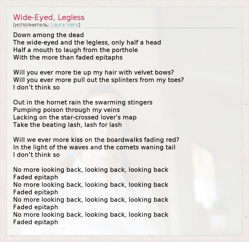 Down among the dead The wide-eyed and the legless, only half a head Half a mouth to laugh from the porthole With the more than faded epitaphs Will you ever more tie up my hair with velvet bows? Will you ever more pull out the splinters from my toes? I don't think so Out in the hornet rain the swarming stingers Pumping poison through my veins Lacking on the star-crossed lover's map Take the beating lash, lash for lash Will we ever more kiss on the boardwalks fading red? In the light of the waves and the comets waning tail I don't think so No more looking back, looking back, looking back Faded epitaph No more looking back, looking back, looking back Faded epitaph No more looking back, looking back, looking back Faded epitaph No more looking back, looking back, looking back Faded epitaph