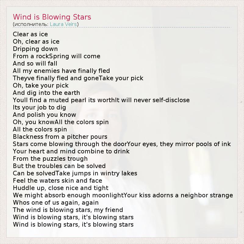 Clear as ice Oh, clear as ice Dripping down From a rockSpring will come And so will fall All my enemies have finally fled Theyve finally fled and goneTake your pick Oh, take your pick And dig into the earth Youll find a muted pearl its worthIt will never self-disclose Its your job to dig And polish you know Oh, you knowAll the colors spin All the colors spin Blackness from a pitcher pours Stars come blowing through the doorYour eyes, they mirror pools of ink Your heart and mind combine to drink From the puzzles trough But the troubles can be solved Can be solvedTake jumps in wintry lakes Feel the waters skin and face Huddle up, close nice and tight We might absorb enough moonlightYour kiss adorns a neighbor strange Whos one of us again, again The wind is blowing stars, my friend Wind is blowing stars, it's blowing stars Wind is blowing stars, it's blowing stars
