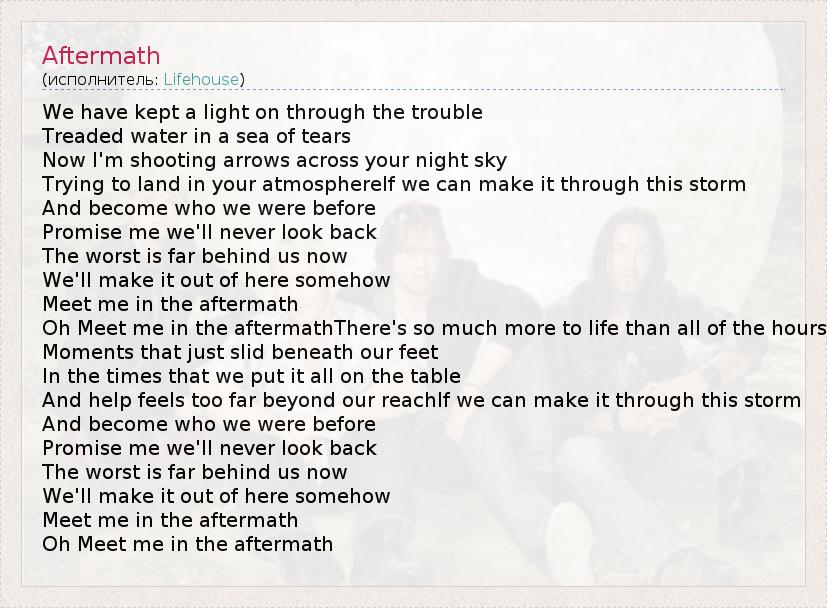 We have kept a light on through the trouble Treaded water in a sea of tears Now I'm shooting arrows across your night sky Trying to land in your atmosphereIf we can make it through this storm And become who we were before Promise me we'll never look back The worst is far behind us now We'll make it out of here somehow Meet me in the aftermath Oh Meet me in the aftermathThere's so much more to life than all of the hours Moments that just slid beneath our feet In the times that we put it all on the table And help feels too far beyond our reachIf we can make it through this storm And become who we were before Promise me we'll never look back The worst is far behind us now We'll make it out of here somehow Meet me in the aftermath Oh Meet me in the aftermath