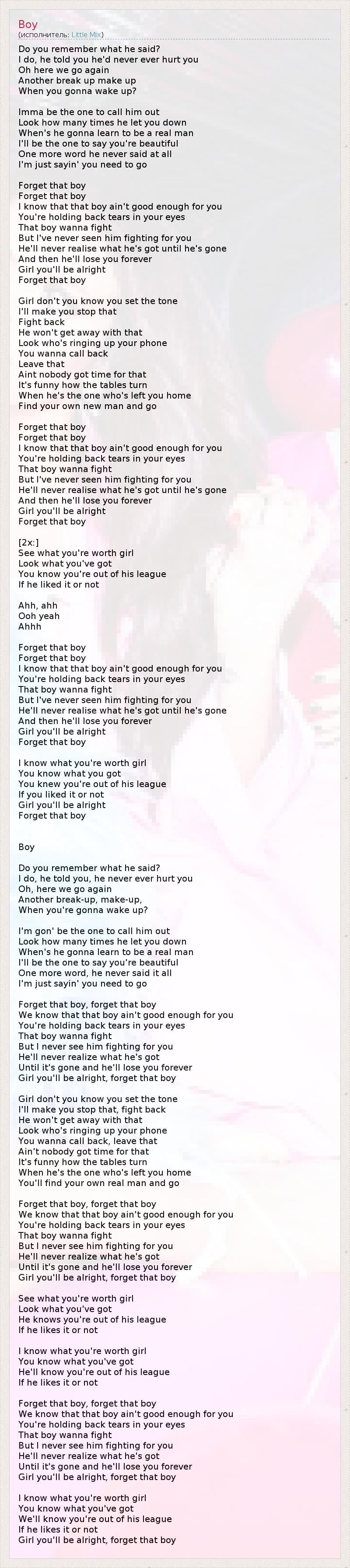 Ты помнишь, что он тебе сказал? А я помню, он сказал, что никогда тебя не обидит, Ну вот, приехали, Очередная ссора и снова примирение, Когда же ты очнешься? Я буду той, кто вызовет его на дуэль, Посмотри, сколько раз он тебя унижал, Когда же он научится быть настоящим мужчиной? Я сама скажу тебе, что ты красавица - Еще одно слово, которого он никогда не произносил, Я просто говорю, что ты должна уйти... Забудь этого парня, Забудь этого парня, Я знаю, что он недостаточно хорош для тебя, Ты чуть не плачешь, Этот парень рвется в бой, Но я никогда не видела, чтобы он сражался за тебя, Он никогда не поймет, что имеет, пока не уйдет, И так потеряет тебя навсегда, Девочка, у тебя все будет в порядке, Забудь этого парня... Девочка, ты что, не понимаешь, что сама задаешь тон? Я заставлю тебя это прекратить, Дай ему сдачи, Он не уйдет безнаказанным, Смотри-ка, кто тебе звонит, Хочешь перезвонить, Брось это дело, Ни у кого нет на это времени, Забавно, как вы поменялись ролями, Раз он оставляет тебя сидеть дома, Найди себе нового мужчину и ... Забудь этого парня, Забудь этого парня, Я знаю, что он недостаточно хорош для тебя, Ты чуть не плачешь, Этот парень рвется в бой, Но я никогда не видела, чтобы он сражался за тебя, Он никогда не поймет, что имеет, пока не уйдет, И так потеряет тебя навсегда, Девочка, у тебя все будет в порядке, Забудь этого парня... [2x:] Посмотри, чего ты достойна, девочка, И посмотри, что ты получила, Он знает, что ты не из его лиги, Нравится это ему или нет... Aаа, aаа Ooу да Aаааа... Забудь этого парня, Забудь этого парня, Я знаю, что он недостаточно хорош для тебя, Ты чуть не плачешь, Этот парень рвется в бой, Но я никогда не видела, чтобы он сражался за тебя, Он никогда не поймет, что имеет, пока не уйдет, И так потеряет тебя навсегда, Девочка, у тебя все будет в порядке, Забудь этого парня... Я знаю, чего ты достойна, девочка, Ты знаешь, что ты получила, Ты знала, что ты не из его лиги, Нравилось тебе это или нет, Девочка, у тебя все будет в порядке, Забудь этого парня... Парень (перевод Mary) Помнишь, что он сказал тебе? А я помню – он говорил, что никогда не причинит тебе боли. О-о, всё по-прежнему: Расставание, перемирие. Когда ты откроешь глаза? Я буду той, что вышвырнет его. Посмотри, сколько раз он подводил тебя, Когда же он поймёт, что такое настоящий мужчина? Я буду говорить тебе, что ты прекрасна – То, чего ты никогда не слышала от него. Я советую тебе уйти от него. Забудь этого парня, забудь этого парня, Я знаю, что он не достоин тебя. Ты сдерживаешь слёзы в глазах. Этого парня всё тянет конфликтовать, Но я никогда не видела, чтобы он боролся за тебя. Он никогда не поймёт, что имеет, Пока не потеряет этого, он потеряет тебя. Милая, у тебя всё будет хорошо, просто забудь этого парня. Разве ты не понимаешь, что всё зависит от тебя? Я заставлю тебя остановить это, и давать отпор, Ему ничего не сойдёт с рук. Смотри-ка, кто звонит – Хочешь ответить? И не думай, На это нет времени. Забавно, как вы поменялись ролями, Ведь теперь дома в одиночестве он, а не ты. Уходи от него, ты ещё найдёшь своего принца. Забудь этого парня, забудь этого парня, Я знаю, что он не достоин тебя. Ты сдерживаешь слёзы в глазах. Этого парня всё тянет конфликтовать, Но я никогда не видела, чтобы он боролся за тебя. Он никогда не поймёт, что имеет, Пока не потеряет этого, он потеряет тебя. Милая, у тебя всё будет хорошо, просто забудь этого 