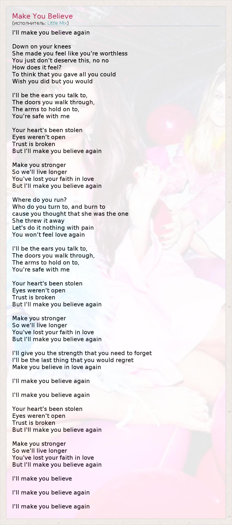 Я заставлю тебя поверить вновь... Ты опустился на колени, Она заставила тебя почувствовать себя никчёмным, Ты же не заслуживаешь этого, нет. Каково это? Думать, что ты отдал всё, что мог, И сожалеть, что не сделал больше... Но ты ведь сделал! Я буду внимать каждому твоему слову, Буду для тебя открытыми дверьми, Буду руками, в которых ты найдёшь поддержку, Со мной ты в безопасности. Твоё сердце было украдено, Глаза - закрыты. Доверие подорвано, Но я заставлю тебя поверить вновь. Ты станешь сильнее, И то, что между нами, не закончится. Ты потерял веру в любовь, Но я заставлю тебя поверить вновь. Куда ты убегаешь? К кому идёшь? К кому прикипел? Ты же думал, что она та единственная... А она свой шанс упустила. Пойми, это пустяк, 1 ведь с болью Ты больше не почувствуешь любви. Я буду внимать каждому твоему слову, Буду для тебя открытыми дверьми, Буду руками, в которых ты найдёшь поддержку, Со мной ты в безопасности. Твоё сердце было украдено, Глаза - закрыты. Доверие подорвано, Но я заставлю тебя поверить вновь. Ты станешь сильнее, И то, что между нами, не закончится. Ты потерял веру в любовь, Но я заставлю тебя поверить вновь. Я дам тебе силу, чтобы забыть. Я буду последним, о чём ты пожалеешь. Я заставлю тебя вновь поверить в любовь. Я заставлю тебя поверить вновь. Я заставлю тебя поверить вновь. Твоё сердце было украдено, Глаза - закрыты. Доверие подорвано, Но я заставлю тебя поверить вновь. Ты станешь сильнее, И то, что между нами, не закончится. Ты потерял веру в любовь, Но я заставлю тебя поверить вновь. Я заставлю тебя поверить. Я заставлю тебя поверить вновь. Я заставлю тебя поверить вновь... 1 - дословно: давай превратим это в ничто