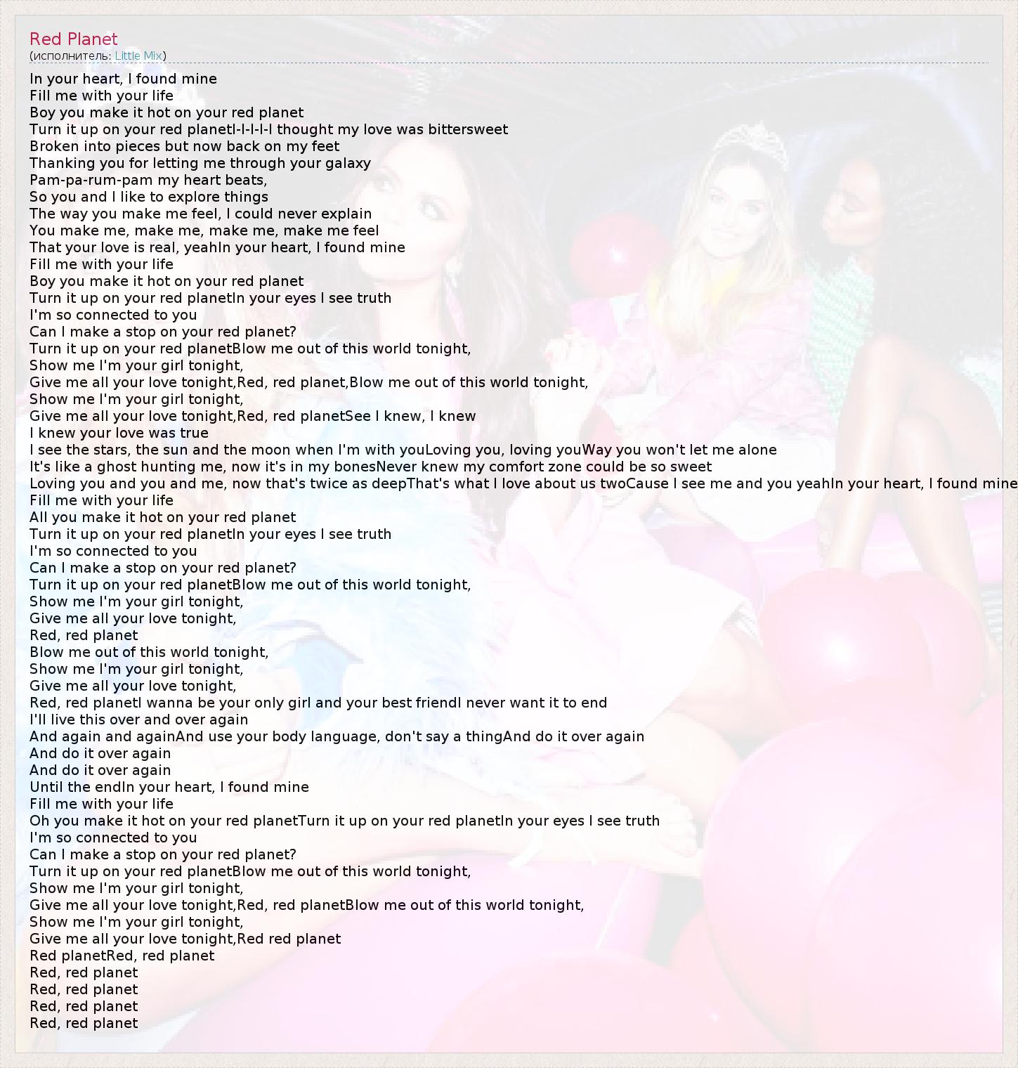 Give me all your love tonight,Red, red planet,Blow me out of this world tonight,