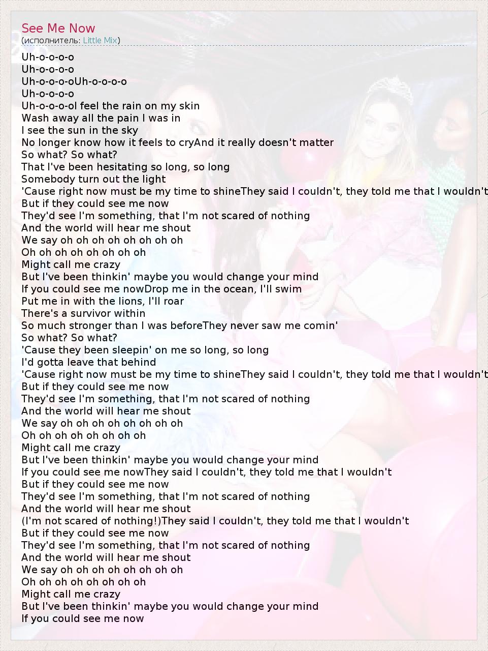 Uh-o-o-o-o Uh-o-o-o-o Uh-o-o-o-oUh-o-o-o-o Uh-o-o-o-o Uh-o-o-o-oI feel the rain on my skin Wash away all the pain I was in I see the sun in the sky No longer know how it feels to cryAnd it really doesn't matter So what? So what? That I've been hesitating so long, so long Somebody turn out the light 'Cause right now must be my time to shineThey said I couldn't, they told me that I wouldn't But if they could see me now They'd see I'm something, that I'm not scared of nothing And the world will hear me shout We say oh oh oh oh oh oh oh oh Oh oh oh oh oh oh oh oh Might call me crazy But I've been thinkin' maybe you would change your mind If you could see me nowDrop me in the ocean, I'll swim Put me in with the lions, I'll roar There's a survivor within So much stronger than I was beforeThey never saw me comin' So what? So what? 'Cause they been sleepin' on me so long, so long I'd gotta leave that behind 'Cause right now must be my time to shineThey said I couldn't, they told me that I wouldn't But if they could see me now They'd see I'm something, that I'm not scared of nothing And the world will hear me shout We say oh oh oh oh oh oh oh oh Oh oh oh oh oh oh oh oh Might call me crazy But I've been thinkin' maybe you would change your mind If you could see me nowThey said I couldn't, they told me that I wouldn't But if they could see me now They'd see I'm something, that I'm not scared of nothing And the world will hear me shout (I'm not scared of nothing!)They said I couldn't, they told me that I wouldn't But if they could see me now They'd see I'm something, that I'm not scared of nothing And the world will hear me shout We say oh oh oh oh oh oh oh oh Oh oh oh oh oh oh oh oh Might call me crazy But I've been thinkin' maybe you would change your mind If you could see me now
