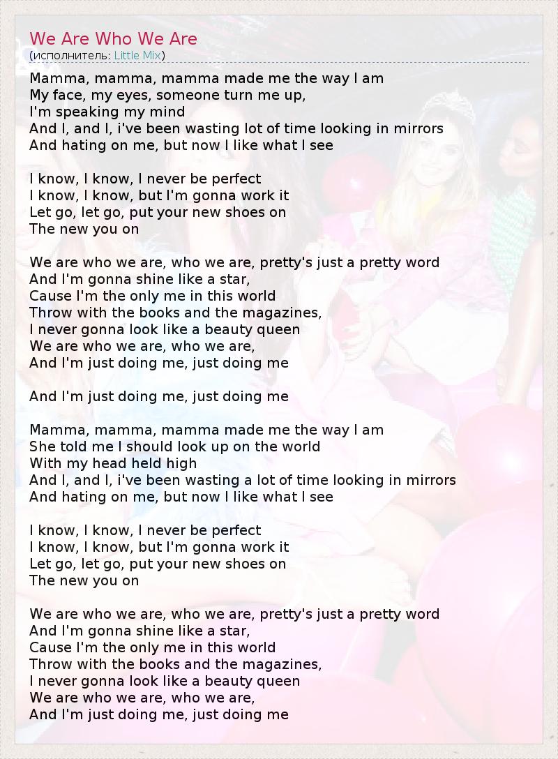 Mamma, mamma, mamma made me the way I am My face, my eyes, someone turn me up, I'm speaking my mind And I, and I, i've been wasting lot of time looking in mirrors And hating on me, but now I like what I see I know, I know, I never be perfect I know, I know, but I'm gonna work it Let go, let go, put your new shoes on The new you on We are who we are, who we are, pretty's just a pretty word And I'm gonna shine like a star, Cause I'm the only me in this world Throw with the books and the magazines, I never gonna look like a beauty queen We are who we are, who we are, And I'm just doing me, just doing me And I'm just doing me, just doing me Mamma, mamma, mamma made me the way I am She told me I should look up on the world With my head held high And I, and I, i've been wasting a lot of time looking in mirrors And hating on me, but now I like what I see I know, I know, I never be perfect I know, I know, but I'm gonna work it Let go, let go, put your new shoes on The new you on We are who we are, who we are, pretty's just a pretty word And I'm gonna shine like a star, Cause I'm the only me in this world Throw with the books and the magazines, I never gonna look like a beauty queen We are who we are, who we are, And I'm just doing me, just doing me