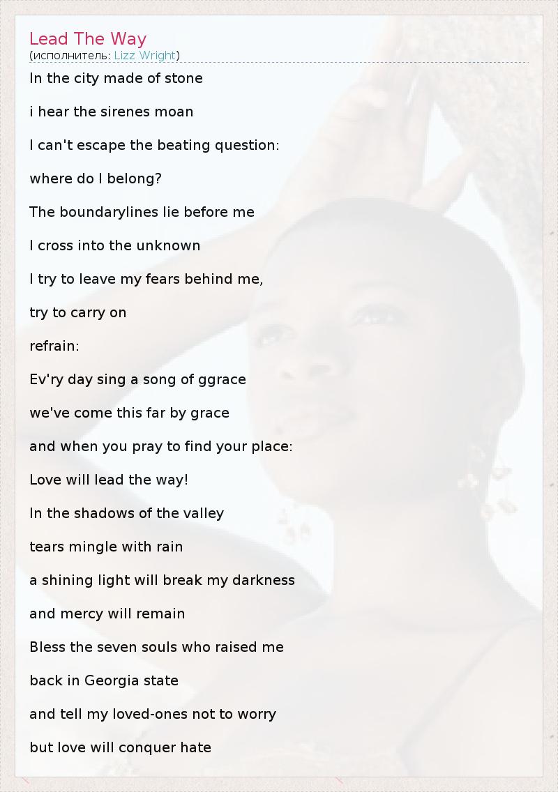 In the city made of stone i hear the sirenes moan I can't escape the beating question: where do I belong? The boundarylines lie before me I cross into the unknown I try to leave my fears behind me, try to carry on refrain: Ev'ry day sing a song of ggrace we've come this far by grace and when you pray to find your place: Love will lead the way! In the shadows of the valley tears mingle with rain a shining light will break my darkness and mercy will remain Bless the seven souls who raised me back in Georgia state and tell my loved-ones not to worry but love will conquer hate