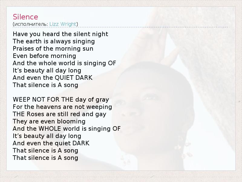 Have you heard the silent night The earth is always singing Praises of the morning sun Even before morning And the whole world is singing OF It’s beauty all day long And even the QUIET DARK That silence is A song WEEP NOT FOR THE day of gray For the heavens are not weeping THE Roses are still red and gay They are even blooming And the WHOLE world is singing OF It’s beauty all day long And even the quiet DARK That silence is A song That silence is A song