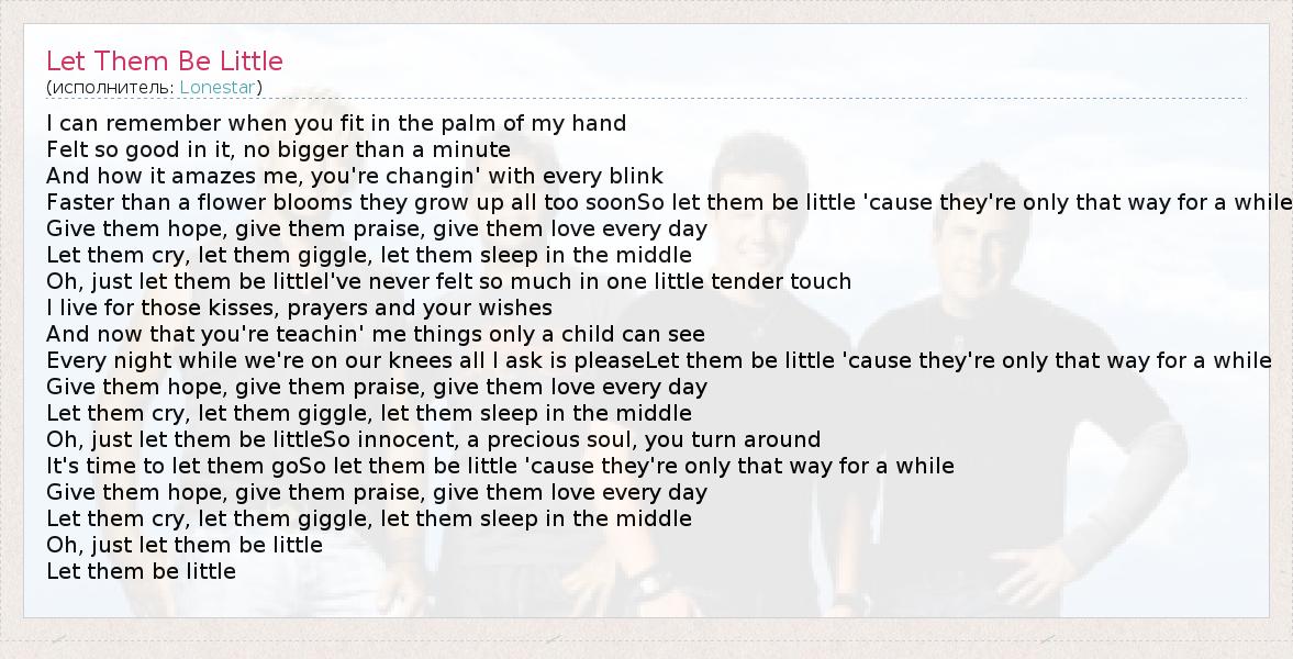 I can remember when you fit in the palm of my hand Felt so good in it, no bigger than a minute And how it amazes me, you're changin' with every blink Faster than a flower blooms they grow up all too soonSo let them be little 'cause they're only that way for a while Give them hope, give them praise, give them love every day Let them cry, let them giggle, let them sleep in the middle Oh, just let them be littleI've never felt so much in one little tender touch I live for those kisses, prayers and your wishes And now that you're teachin' me things only a child can see Every night while we're on our knees all I ask is pleaseLet them be little 'cause they're only that way for a while Give them hope, give them praise, give them love every day Let them cry, let them giggle, let them sleep in the middle Oh, just let them be littleSo innocent, a precious soul, you turn around It's time to let them goSo let them be little 'cause they're only that way for a while Give them hope, give them praise, give them love every day Let them cry, let them giggle, let them sleep in the middle Oh, just let them be little Let them be little