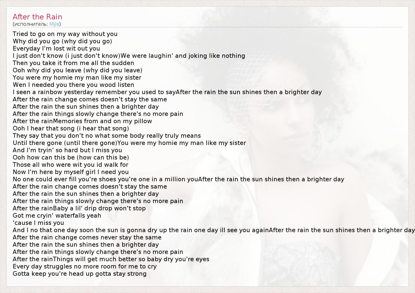 And I no that one day soon the sun is gonna dry up the rain one day ill see you againAfter the rain the sun shines then a brighter day