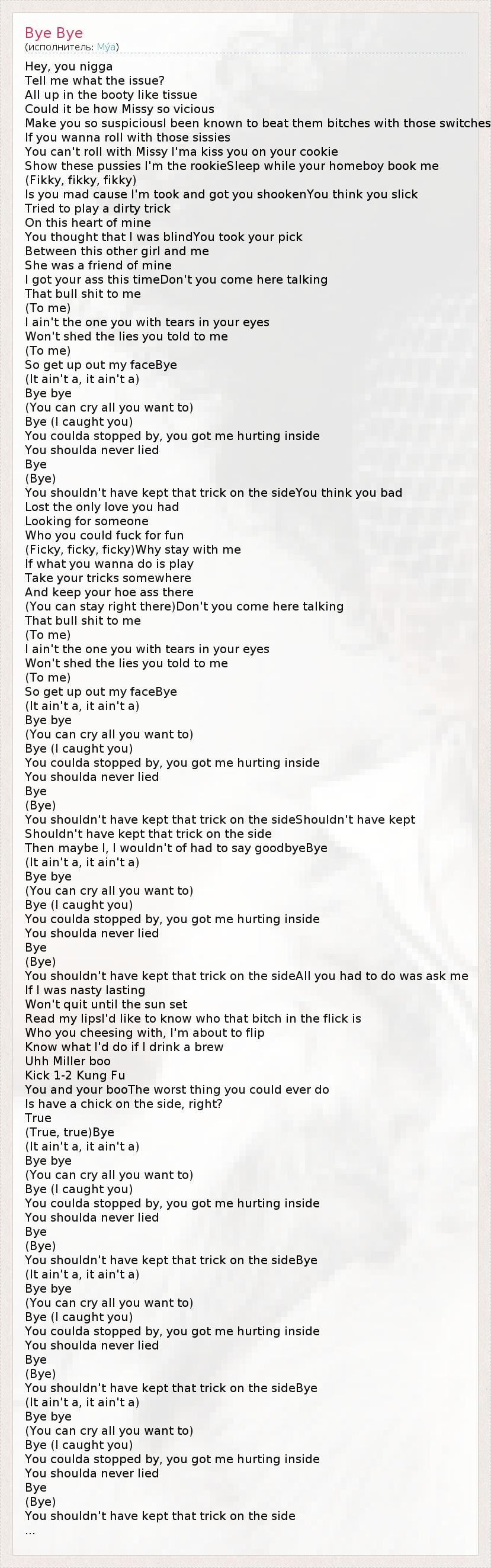 Hey, you nigga Tell me what the issue? All up in the booty like tissue Could it be how Missy so vicious Make you so suspiciousI been known to beat them bitches with those switches If you wanna roll with those sissies You can't roll with Missy I'ma kiss you on your cookie Show these pussies I'm the rookieSleep while your homeboy book me (Fikky, fikky, fikky) Is you mad cause I'm took and got you shookenYou think you slick Tried to play a dirty trick On this heart of mine You thought that I was blindYou took your pick Between this other girl and me She was a friend of mine I got your ass this timeDon't you come here talking That bull shit to me (To me) I ain't the one you with tears in your eyes Won't shed the lies you told to me (To me) So get up out my faceBye (It ain't a, it ain't a) Bye bye (You can cry all you want to) Bye (I caught you) You coulda stopped by, you got me hurting inside You shoulda never lied Bye (Bye) You shouldn't have kept that trick on the sideYou think you bad Lost the only love you had Looking for someone Who you could fuck for fun (Ficky, ficky, ficky)Why stay with me If what you wanna do is play Take your tricks somewhere And keep your hoe ass there (You can stay right there)Don't you come here talking That bull shit to me (To me) I ain't the one you with tears in your eyes Won't shed the lies you told to me (To me) So get up out my faceBye (It ain't a, it ain't a) Bye bye (You can cry all you want to) Bye (I caught you) You coulda stopped by, you got me hurting inside You shoulda never lied Bye (Bye) You shouldn't have kept that trick on the sideShouldn't have kept Shouldn't have kept that trick on the side Then maybe I, I wouldn't of had to say goodbyeBye (It ain't a, it ain't a) Bye bye (You can cry all you want to) Bye (I caught you) You coulda stopped by, you got me hurting inside You shoulda never lied Bye (Bye) You shouldn't have kept that trick on the sideAll you had to do was ask me If I was nasty lasting Won't quit until the sun set Read my lipsI'd like to know who that bitch in the flick is Who you cheesing with, I'm about to flip Know what I'd do if I drink a brew Uhh Miller boo Kick 1-2 Kung Fu You and your booThe worst thing you could ever do Is have a chick on the side, right? True (True, true)Bye (It ain't a, it ain't a) Bye bye (You can cry all you want to) Bye (I caught you) You coulda stopped by, you got me hurting inside You shoulda never lied Bye (Bye) You shouldn't have kept that trick on the sideBye (It ain't a, it ain't a) Bye bye (You can cry all you want to) Bye (I caught you) You coulda stopped by, you got me hurting inside You shoulda never lied Bye (Bye) You shouldn't have kept that trick on the sideBye (It ain't a, it ain't a) Bye bye (You can cry all you want to) Bye (I caught you) You coulda stopped by, you got me hurting inside You shoulda never lied Bye (Bye) You shouldn't have kept that trick on the side ...